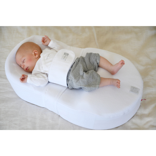 CocoonaBaby Red Castle je ergonomicky tvarovaná podložka podložka na spaní pro děti od narození do 3 měsíců. Podložka svým tvarem umožňuje dítěti ležet v podobné poloze, v jaké se nacházelo před narozením a tím přispívá k jeho klidu a pocitu bezpečí. Poloha dítěte v podložce CocoonBaby s jemným 10° sklonem přispívá k delšímu a klidnějšímu spánku bez refluxních obtíží. Břišní pás neomezuje pohyb rukou a nohou dítěte a zároveň svým jemným tlakem na bříško dítě uklidňuje. Výplň podložky z vysoce prážné pěny se vrací do původního tvaru, nenutí dítě do pevné polohy a podporuje jeho přirozenou motoriku. Podložka byla navržena dětskými fyzioterapeuty a lékaři. Je určena pro použití v dětské postýlce, není vhodná pro použití v košíku, kolébce či kočárku. Přestaňte podložku používat, když se dítě začne snažit otáčet. Rozměry: 69 × 40 × 19 cm Snímatelný bavlněný potah je možno prát v pračce. Vhodné pro děti od narození (od 2,8 kg) do 3 měsíců.