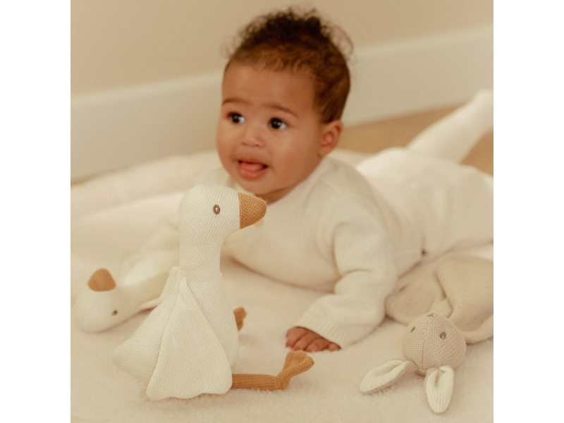 Krásná dárková sada hraček z jemné pleteniny je ideální jako dárek pro novorozené miminko. Sada obsahuje muchláčka s králíčkem a dvě hračky v podobě husy. Vyrobeno z jemných, příjemných materiálů v přírodních tónech Ideální velikost a měkkost pro novorozence Stylové balení – připraveno jako dárek pro miminko i jeho rodiče Sada je součástí designové kolekce hraček Little Dutch Newborn Naturals. Rozměry krabice: 27 x 27 x 11 cm Složení: 100% polyester Výplň je vyrobena ze 100% recyklovaného polyesteru s certifikací GRS (Global Recycled Standard). Možno prát v pračce na jemný program při 30°C. Vhodné pro děti od narození.