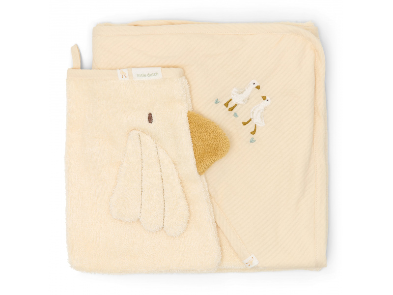 Dárková sada z kolekce Little Dutch Newborn Naturals obsahuje osušku s kapucí a žínku z jemné organické bavlny v krásném designovém provedení. Je ideální pro každodenní péči o miminko i jako stylový dárek k narození dítěte. Součástí sady je žínka ve tvaru husy a osuška s vyšitým motivem husy Vyrobeno ze 100% organické bavlny, která je mimořádně měkká, savá a šetrná k dětské pokožce Praktická osuška s kapucí rychle zahřeje po koupeli a zajistí miminku pohodlí miminku Hebká žínka je perfektní pro jemné mytí i zábavu při koupání Stylové dárkové balení - krabička je nejen krásná, ale i praktická a skvěle poslouží pro uchování vzpomínek z prvních let života dítěte Složení: 100% organická bavlna Rozměry: ssuška 75 × 75 cm, žínka: 14 × 21 cm
