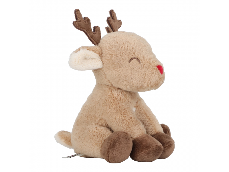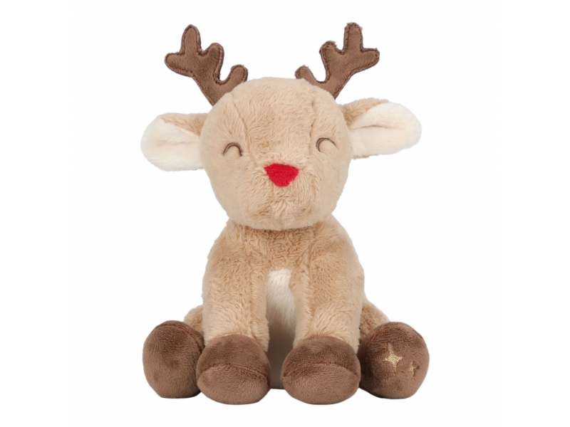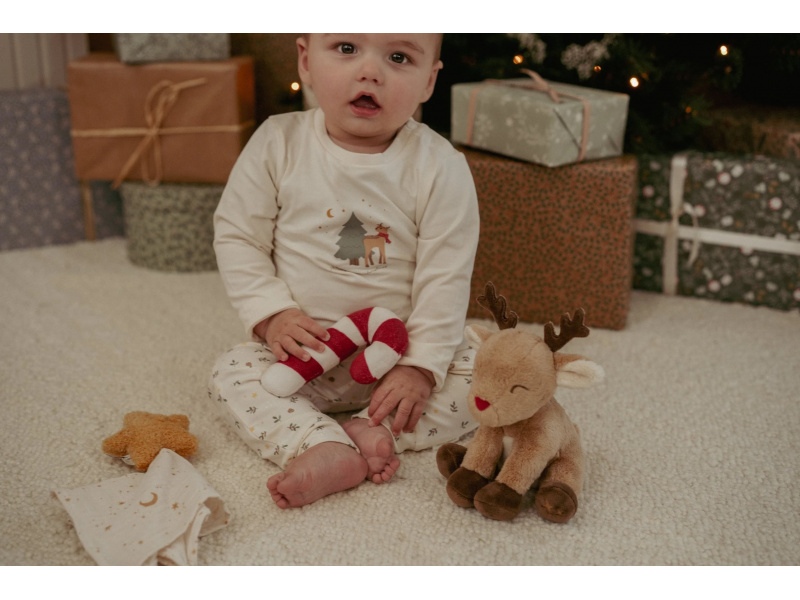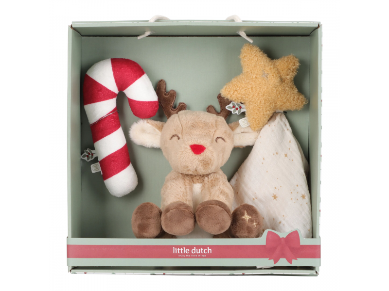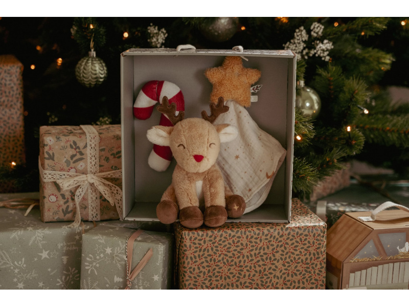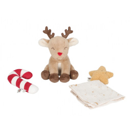 Speciální vánoční edice dárkové sady plyšových hraček obsahuje roztomilého plyšového soba, muchláčka s hvězdou a plyšovou cukrovou hůlku. Sada je vhodná jako vánoční dárek i jako dárek pro novorozené miminko. Rozměry krabice: 27 x 27 x 11 cm Složení: 100% polyester Výplň je vyrobena ze 100% recyklovaného polyesteru s certifikací GRS (Global Recycled Standard). Možno prát v pračce na jemný program při 30°C. Vhodné pro děti od narození.