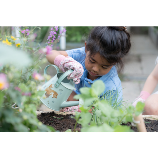 10-dílná sada nářadí v krásném provedení obsahuje vše, co malá zahradnice či zahradník potřebují: konvičku na zalévání, zahradnické rukavice, dvě lopatky a hrabičky v kvalitním provedení z odolného kovu s dřevěnou rukojetí a tři zapichovací dřevěné jmenovky. Vše je uloženo v praktické pevné tašce z bavlněného plátna s množstvím kapes pro přehledné ukládání a snadné přenášení. Nářadí i taška jsou zdobené krásným potiskem motivů ze života v lese. Sada je součástí designové kolekce hraček a doplňků Little Dutch Forest Friends, inspirované životem v lese. Vhodné pro děti od 3 let.