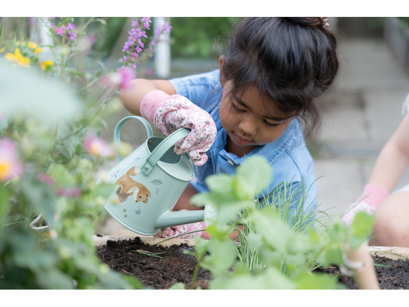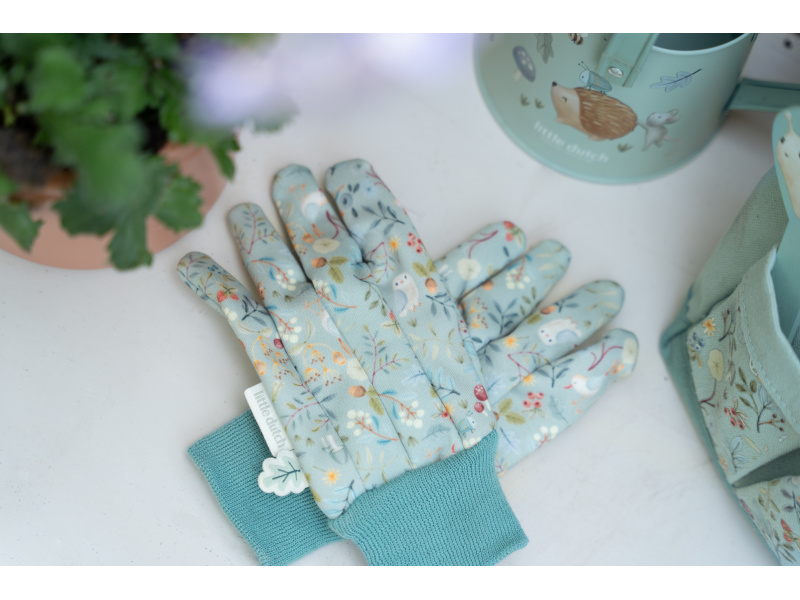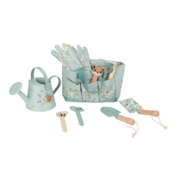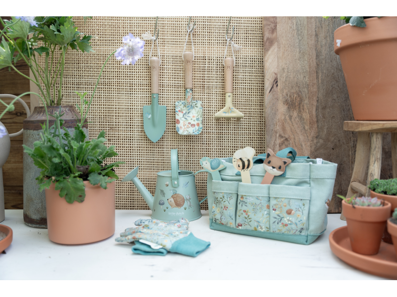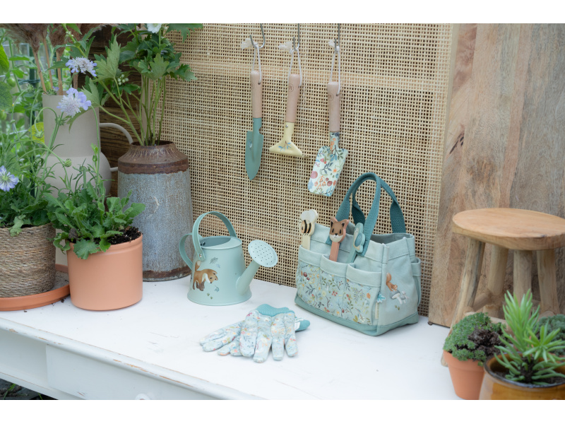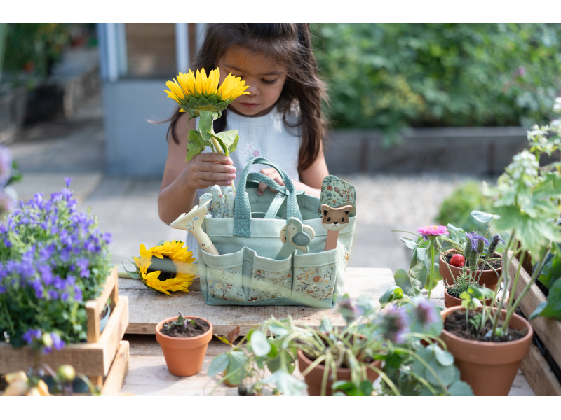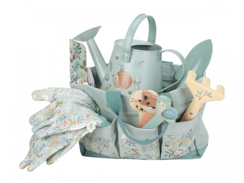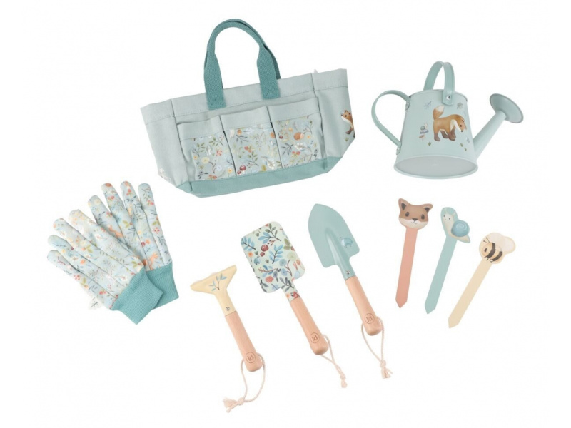 10-dílná sada nářadí v krásném provedení obsahuje vše, co malá zahradnice či zahradník potřebují: konvičku na zalévání, zahradnické rukavice, dvě lopatky a hrabičky v kvalitním provedení z odolného kovu s dřevěnou rukojetí a tři zapichovací dřevěné jmenovky. Vše je uloženo v praktické pevné tašce z bavlněného plátna s množstvím kapes pro přehledné ukládání a snadné přenášení. Nářadí i taška jsou zdobené krásným potiskem motivů ze života v lese. Sada je součástí designové kolekce hraček a doplňků Little Dutch Forest Friends, inspirované životem v lese. Vhodné pro děti od 3 let.