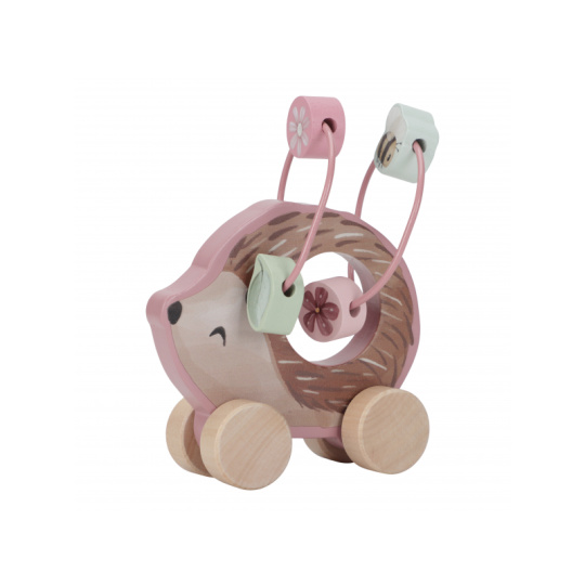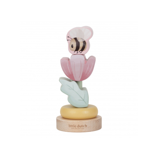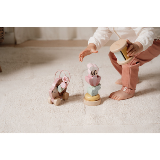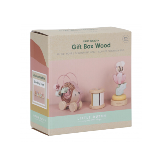 Dárková sada obsahuje tři krásné dřevěné hračky s něžným potiskem motivů ze života na zahradě. Chrastítko ve tvaru válečku při pohybu jemně cinká, skládací květina s včeličkou vybízí k rozložení a znovu složení. Třetí hračkou je roztomilý ježek na kolečkách se spirálou, na které se pohybují dřevěné korálky v podobě kytiček, listu a včelky. Dárkový set je součástí designové kolekce hraček a doplňků Little Dutch Fairy Garden inspirované životem na zahradě. Vyrobeno z dřeva certifikovaného FSC. Rozměry boxu: 21 x 20 x 8,4 cm Vhodné pro děti od 12 měsíců.
