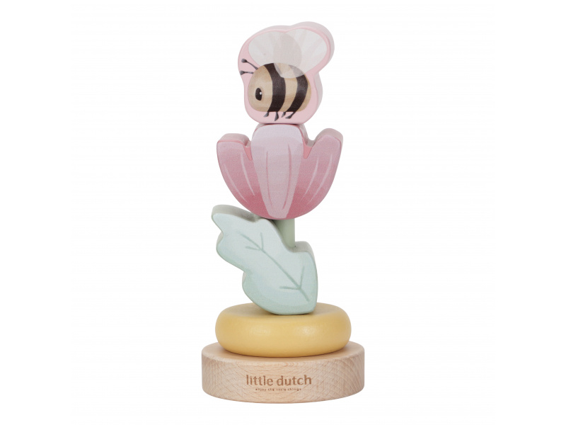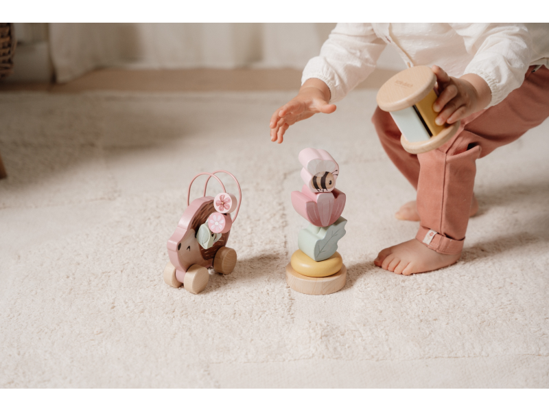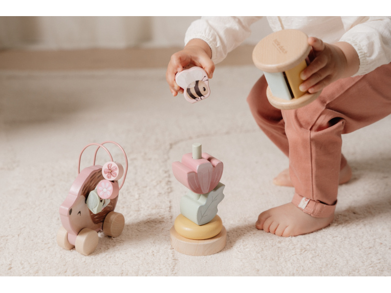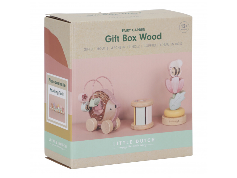 Dárková sada obsahuje tři krásné dřevěné hračky s něžným potiskem motivů ze života na zahradě. Chrastítko ve tvaru válečku při pohybu jemně cinká, skládací květina s včeličkou vybízí k rozložení a znovu složení. Třetí hračkou je roztomilý ježek na kolečkách se spirálou, na které se pohybují dřevěné korálky v podobě kytiček, listu a včelky. Dárkový set je součástí designové kolekce hraček a doplňků Little Dutch Fairy Garden inspirované životem na zahradě. Vyrobeno z dřeva certifikovaného FSC. Rozměry boxu: 21 x 20 x 8,4 cm Vhodné pro děti od 12 měsíců.
