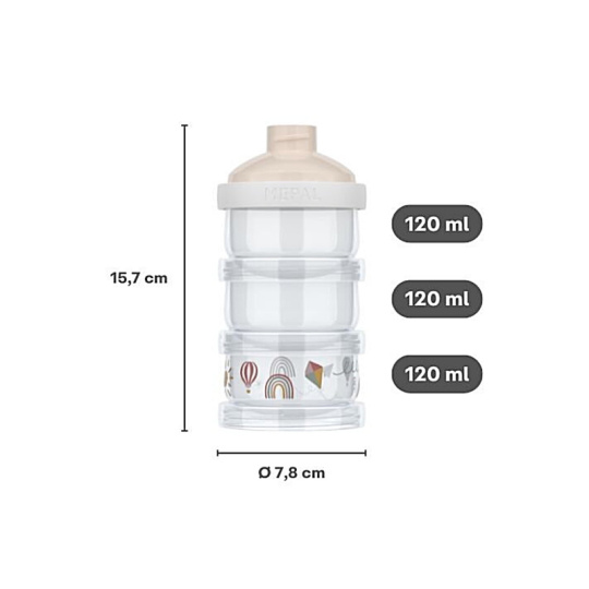Třídílná nádoba na sušené mléko Little Dutch Forest Friends nabízí jednoduchý a hygienický způsob přípravy kojeneckého mléka doma na cestách. Nádoba obsahuje tři stohovatelné kelímky, které jsou jednotlivě uzavřeny šroubovacími víčky. Praktické nasýpací víčko nahoře usnadňuje dávkování sušeného mléka do lahve. ideální pro přípravu mléka v noci i na cestách hermeticky uzavíratelné pro tři odměřené dávky sušeného mléka vhodné do myčky Dávkovač s krásným potiskem je součástí designové kolekce hraček a doplňků Little Dutch Forest Friends, inspirované životem v lese. Objem: 3 x 120 ml Složení: 100% PP, bez obsahu BPA