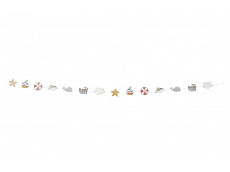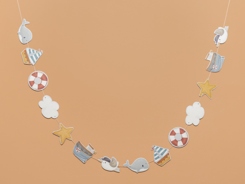 Dekorativní girlanda s krásnými motivy kolekce Námořnický záliv se stane originální ozdobou dětského pokoje. Plachetnice, rackové, velryby a další motivy ze života na moři pomohou rozvíjet fantazii vašeho dítěte, když mu před spaním budete vyprávět příběhy o životě na moři. Girlandu můžete zavěsit na stěnu, na okno či na poličku. Girlanda je součástí designové kolekce Little Dutch Námořnický záliv, ve které najdete ložní prádlo, dekorativní doplňky do dětského pokoje, dřevěné a plyšové hračky i jídelní doplňky pro dětské stolování. Celková délka šňůrky girlandy je 200 cm. Motivy na girlandě jsou vyrobeny z kvalitního silného kartonu.