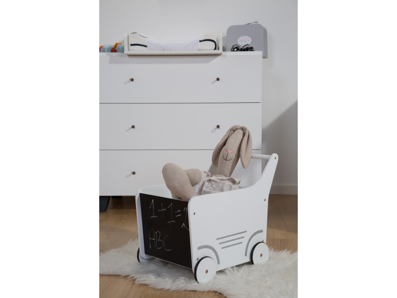 Krásný dřevěný kočárek využijete jako box na hračky i jako originální dekoraci dětského pokoje. Přední stěnu tvoří tabule pro malování křídami. Rozměry: 46 x 48 x 31 cm Maximální nosnost: 5 kg Výrobek není hračka.