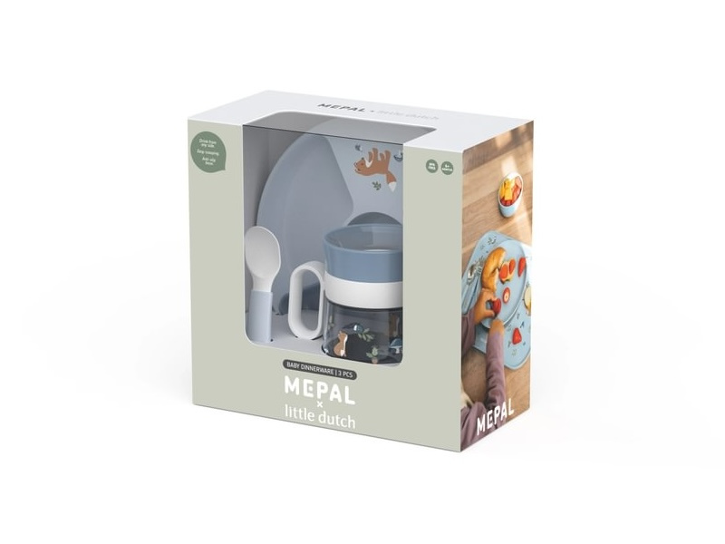 3-dílná jídelní sada v krásném designu s jemným potiskem obsahuje dětský dělený talíř, trénovací hrnek se systémem 360° a lžičku. Dětský talíř s krásným potiskem má protiskluzové dno a vysoký okraj, který pomáhá dítěti jídlo nabrat na lžíci. Talíř je tak ideální pro první samostatné stolování dítěte. Vyjímatelná přihrádka umožňuje rozdělení jednotlivých částí jídla do 2, 3 nebo 4 přihrádek. Díky praktickému úchytu se talíř snadno přenáší. Je vyroben z lehkého, mimořádně odolného plastu. Trénovací hrnek 200 ml je ideální pro děti, které se učí pít z klasického hrnku. Silikonové víčko se systémem 360° umožňuje pít z kteréhokoli místa po obvodu hrnku bez rizika rozlití. Tekutina teče z hrnku po naklonění k ústům dítěte kontrolovaným způsobem, takže dítě na sebe při pití obsah hnku nevylije. Když pít přestane, hrnek se díky speciální membráně automaticky uzavře. Držadla usnadňují držení hrnku malými dětskými ručičkami. Sada je součástí designové kolekce hraček a doplňků pro děti Little Dutch Forest Friends, inspirované životem v lese. Vhodné do myčky i mikrovlnné trouby. Materiál: PP, TPE, silikon, Tritan, neobsahuje melamin ani BPA Rozměry talíře: průměr 20 cm, výška 2,7 cm Objem hrnku: 200 ml Vhodné pro děti od 6 měsíců.