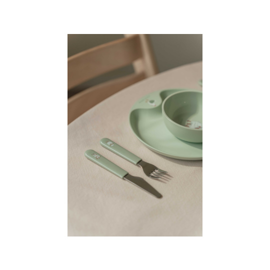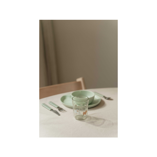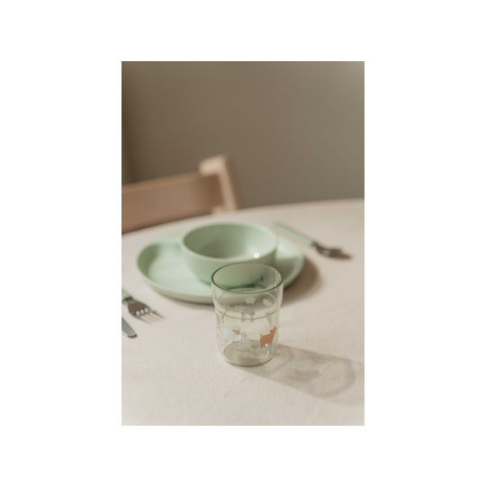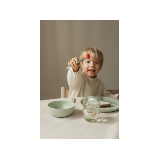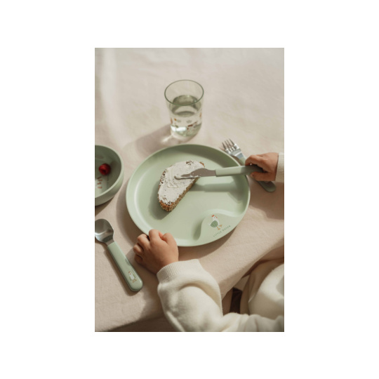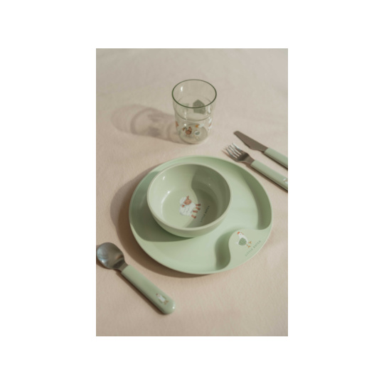 6-dílná jídelní sada v krásném designu s jemným potiskem obsahuje dětský talíř, misku, kelímek, lžíci, vidličku a nůž. Dětský talíř je vhodný pro samostatné stolování dítěte, díky praktickému úchytu se snadno přenáší. Miska je ideální pro servírování dětským zeleninových či ovocných příkrmů, polévek, kaší, ovoce apod. Talíř i miska jsou vyrobeny z lehkého, mimořádně odolného plastu. Kelímek z průhledného, odolného plastu je ideální pro děti, které se učí pít ze skleničky. Příbor z kvalitní nerezové oceli s plastovou rukojetí pro snadné držení usnadní dítěti přechod z krmení lžičkou na stolování s příborem. Sada je součástí designové kolekce hraček a doplňků pro děti Little Dutch Farma. Rozměry talíře: průměr 22 cm, výška 2 cm Miska: objem 300 ml Kelímek: objem 250 ml Rozměry příboru: vidlička / lžíce 14,5 cm, nůž 16,5 cm Všechny součásti sady je možné mýt v myčce. Zdravotně nezávadný materiál neobsahuje melamin ani BPA. Vhodné pro děti od 12 měsíců.