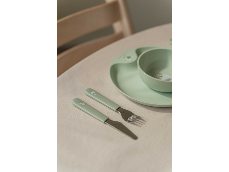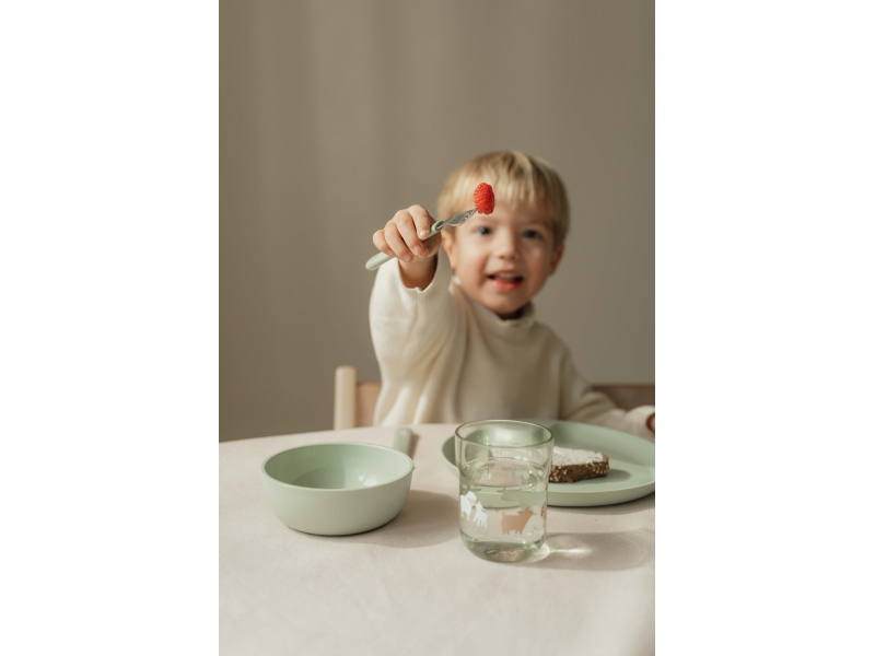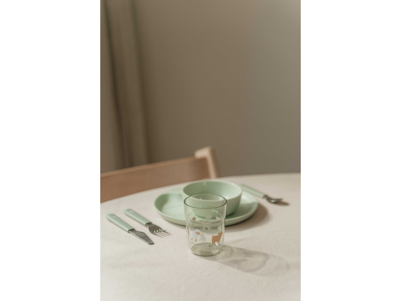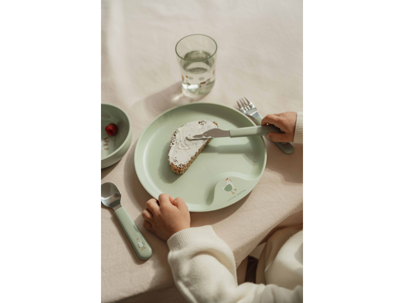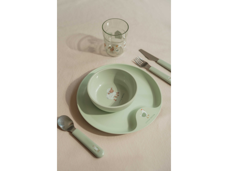 6-dílná jídelní sada v krásném designu s jemným potiskem obsahuje dětský talíř, misku, kelímek, lžíci, vidličku a nůž. Dětský talíř je vhodný pro samostatné stolování dítěte, díky praktickému úchytu se snadno přenáší. Miska je ideální pro servírování dětským zeleninových či ovocných příkrmů, polévek, kaší, ovoce apod. Talíř i miska jsou vyrobeny z lehkého, mimořádně odolného plastu. Kelímek z průhledného, odolného plastu je ideální pro děti, které se učí pít ze skleničky. Příbor z kvalitní nerezové oceli s plastovou rukojetí pro snadné držení usnadní dítěti přechod z krmení lžičkou na stolování s příborem. Sada je součástí designové kolekce hraček a doplňků pro děti Little Dutch Farma. Rozměry talíře: průměr 22 cm, výška 2 cm Miska: objem 300 ml Kelímek: objem 250 ml Rozměry příboru: vidlička / lžíce 14,5 cm, nůž 16,5 cm Všechny součásti sady je možné mýt v myčce. Zdravotně nezávadný materiál neobsahuje melamin ani BPA. Vhodné pro děti od 12 měsíců.