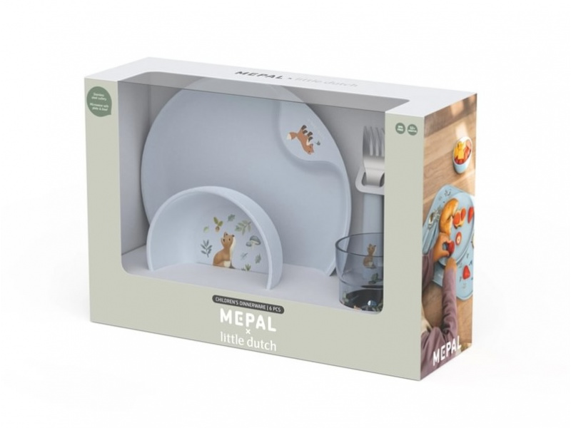 6-dílná jídelní sada v krásném designu s jemným potiskem obsahuje dětský talíř, misku, kelímek, lžíci, vidličku a nůž. Dětský talíř je vhodný pro samostatné stolování dítěte, díky praktickému úchytu se snadno přenáší. Miska je ideální pro servírování dětským zeleninových či ovocných příkrmů, polévek, kaší, ovoce apod. Talíř i miska jsou vyrobeny z lehkého, mimořádně odolného plastu. Kelímek z průhledného, odolného plastu je ideální pro děti, které se učí pít ze skleničky. Příbor z kvalitní nerezové oceli s plastovou rukojetí pro snadné držení usnadní dítěti přechod z krmení lžičkou na stolování s příborem. Sada je součástí designové kolekce hraček a doplňků pro děti Little Dutch Forest Friends, inspirované životem v lese. Rozměry talíře: průměr 22 cm, výška 2 cm Miska: objem 300 ml Kelímek: objem 250 ml Rozměry příboru: vidlička / lžíce 14,5 cm, nůž 16,5 cm Všechny součásti sady je možné mýt v myčce. Zdravotně nezávadný materiál neobsahuje melamin ani BPA. Vhodné pro děti od 12 měsíců.