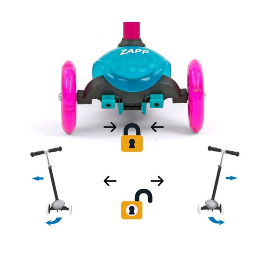 Abychom vyhověli potřebám našich malých závodníků, vytvořili jsme koloběžku ZAPP. Je ideálním řešením pro aktivní děti, které mají rády pohyb. Zapp je vyroben z kvalitních materiálů, je ideální na procházky nebo řádění kolem domu. Kovová konstrukce zaručuje odolnost výrobku. Koloběžka má navíc brzdu a blatník na zadním kolečku. Řízení a zatáčení pracuje na principu změny rovnováhy těla. Velkou výhodou koloběžky jsou 3 kola, které poskytnou stabilitu a bezpečnost. Děti potěší také, svítíci přední kola během jízdy.