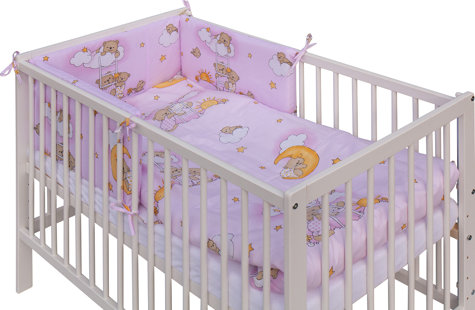 Součástí balení je kompletní výbava – kvalitní matrace, roztomilá sada povlečení, mantinel a prostěradlo, takže máte vše potřebné hned po rozbalení.