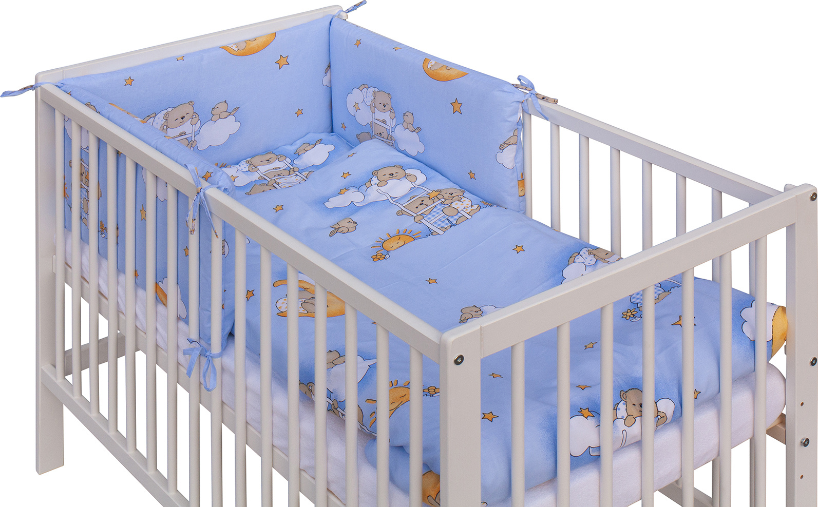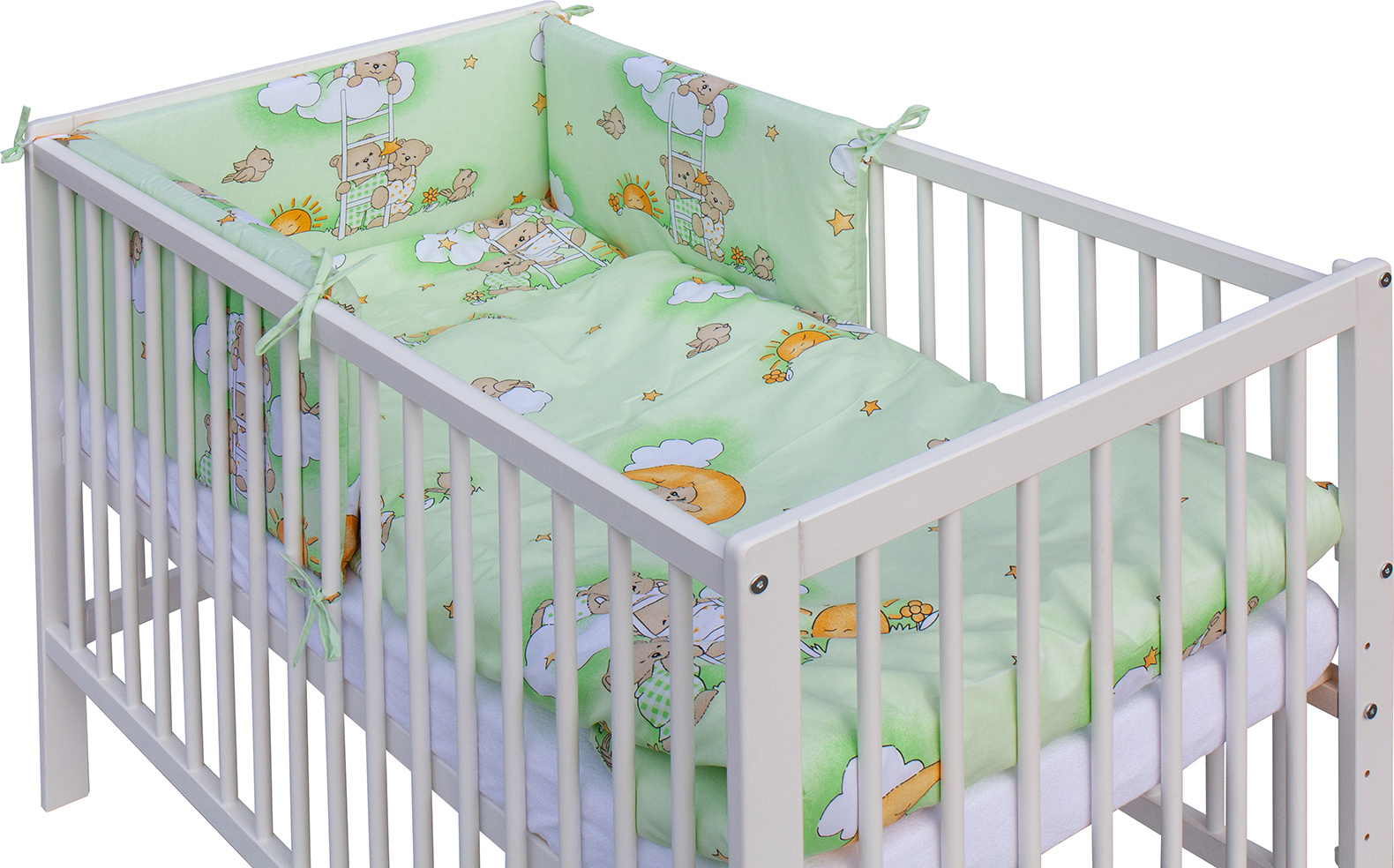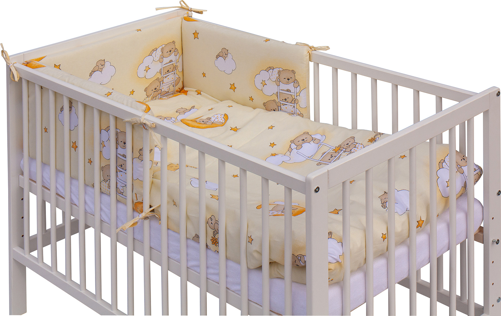 Součástí balení je kompletní výbava – kvalitní matrace, roztomilá sada povlečení, mantinel a prostěradlo, takže máte vše potřebné hned po rozbalení.