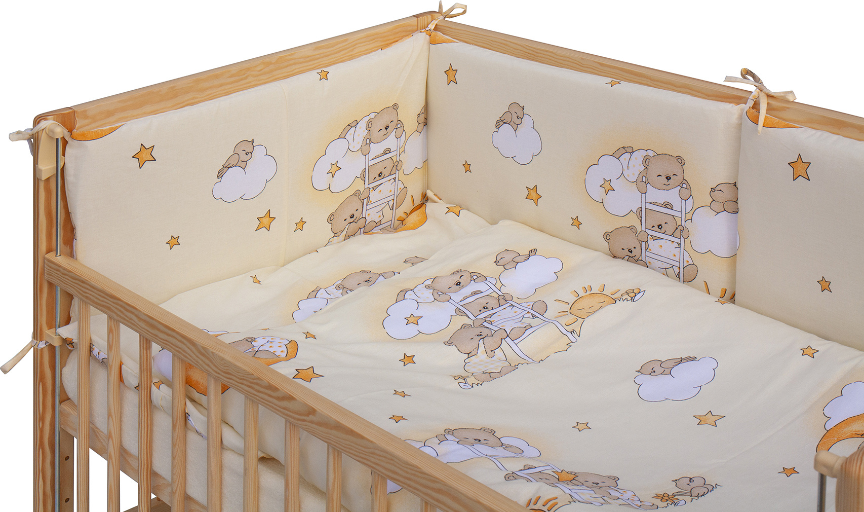 Součástí balení je kompletní výbava – kvalitní matrace, roztomilá sada povlečení, mantinel a prostěradlo, takže máte vše potřebné hned po rozbalení.