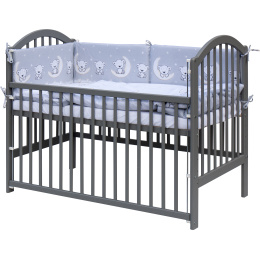1 . Dětská dřevěná postýlka 120x60 cm - šedá , masiv, stahovací bok, 6 poloh roštu, nohy postýlky jsou předvrtané pro možné nasazení koleček