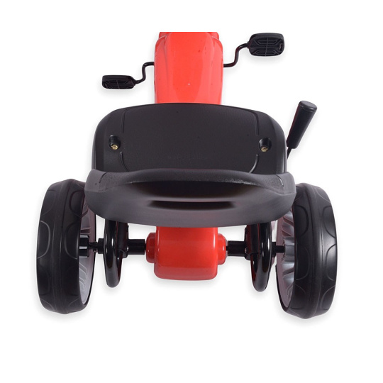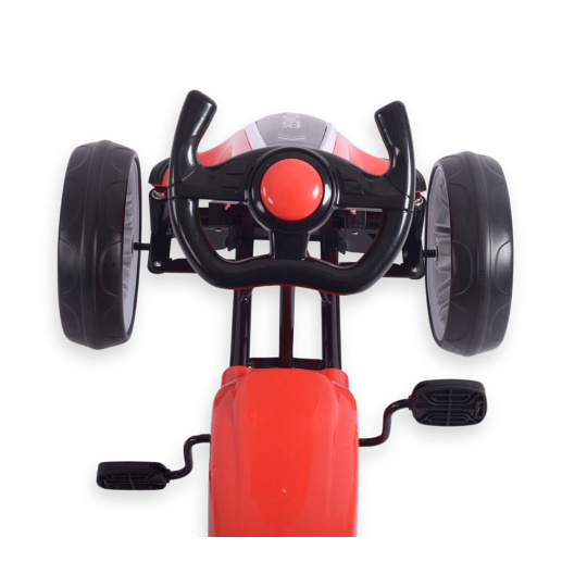 Vozidlo je vyrobeno z lehké kovové konstrukce a vysoce kvalitních plastů pro dlouhou životnost a odolnost proti poškození. Má zabudovaný řetězový pohon s pedály a velká, odolná kola s pěnovými pneumatikami (EVA) pro dobrou přilnavost a pohodlí na různých površích. Ergonomická sportovní řídítka umožňují pevný úchop a snadné řízení, zatímco tvarované sedadlo poskytuje pohodlnou jízdu. Je také vybaveno ruční nouzovou brzdou.