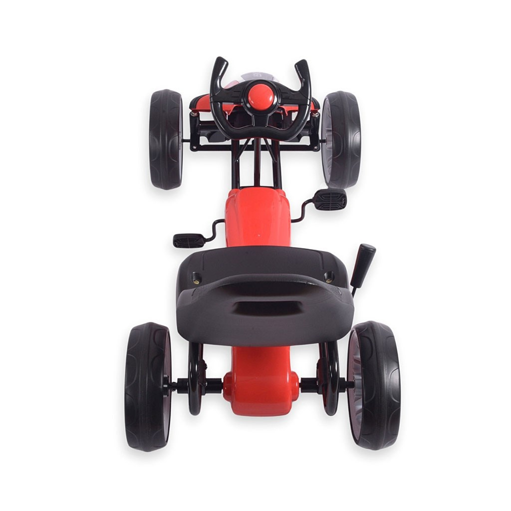 Vozidlo je vyrobeno z lehké kovové konstrukce a vysoce kvalitních plastů pro dlouhou životnost a odolnost proti poškození. Má zabudovaný řetězový pohon s pedály a velká, odolná kola s pěnovými pneumatikami (EVA) pro dobrou přilnavost a pohodlí na různých površích. Ergonomická sportovní řídítka umožňují pevný úchop a snadné řízení, zatímco tvarované sedadlo poskytuje pohodlnou jízdu. Je také vybaveno ruční nouzovou brzdou.