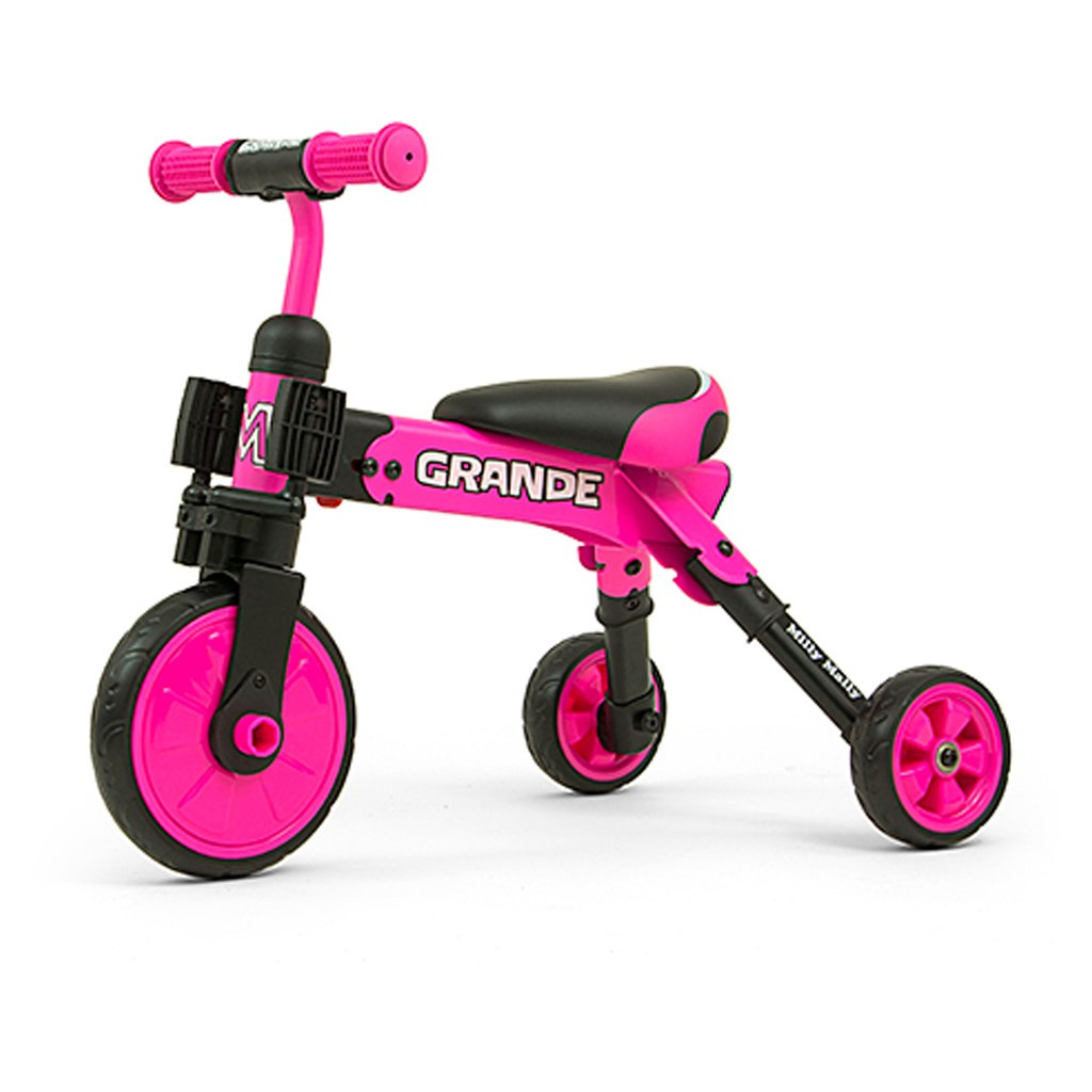 Kompaktní dětská šlapací tříkolka Milly Mally 2v1 Grande je ideálním řešením pro děti, které se právě začínají učí jezdit na kole a přitom ještě nejsou schopné udržet rovnováhu na dvou kolech. Je vyrobena z kvalitních a odolných materiálů a je ideální na procházky. Velkou výhodou této tříkolky je snadná montáž pedálů a nebo snadné složení celé tříkolky. Pěnová kola výborně absorbují rázy, poskytují dobrou přilnavost, zajistí pohodlí během jízdy a neunaví vašeho malého závodníka. Doraz nedovolí přetočení řídítek.