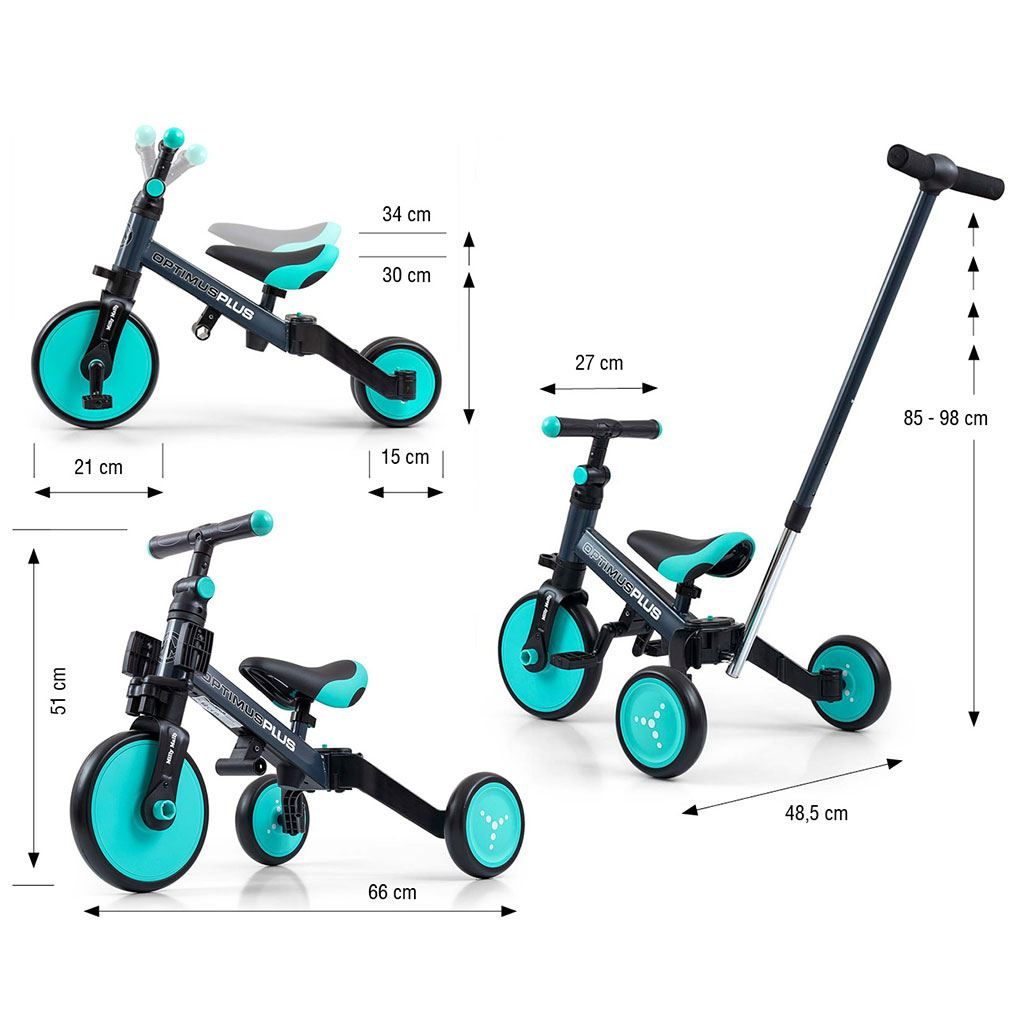 Univerzální dětská šlapací tříkolka Milly Mally 4v1 Optimus byla navržena tak, aby se stala tím nejlepším co můžete nabídnout svému malému závodníkovi. Díky stabilní konstrukci poskytuje dítěti maximální úroveň bezpečnosti a tímto mu usnadňuje získávání nových dovedností. Největší výhodou této tříkolky je její variabilita. Jakmile dítě získá základy jízdy, připojíme pedály nebo jí během okamžiku změníme na klasické jednostopé odrážedlo. Pěnová kola výborně absorbují rázy, poskytují dobrou přilnavost, zajistí pohodlí během jízdy a neunaví vašeho malého závodníka. Dostatečný rozvor kol poskytuje mimořádnou stabilitu, bezpečnost během používání doma i venku. Doraz nedovolí přetočení řídítek.