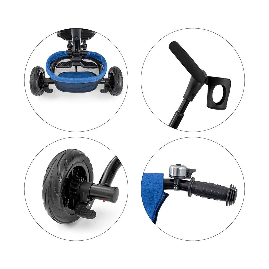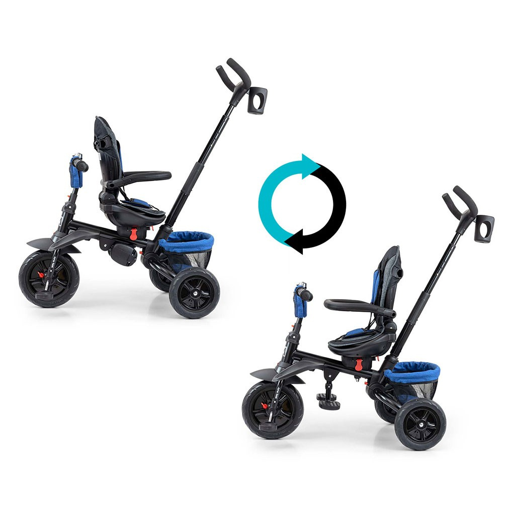 Je vyrobena z kvalitních a odolných materiálů. Má moderní konstrukci, pohodlné a ergonomicky tvarované sedadlo, které je otočné o 360 stupňů, což umožní dítěti cestovat ve směru nebo proti směru jízdy. O pohodlí a bezpečí během jízdy se stará bariérka, tříbodové bezpečnostní pásy, pohodlné stupačky nebo gumová kola, které skvěle absorbují rázy a poskytují dobrou přilnavost. Tříkolku může ovládat jak dítě, tak i rodič pomocí nastavitelné rukojeti pro tlačení. Po odebrání vodící tyče, sklápěcí stříšky, která chrání před sluncem nebo ostatních komponent bude sloužit jako tříkolka. Tříkolku lze používat rovněž jako alternativu golfového kočárku. Pro uložení hraček nebo potřeb pro dítě je zde praktický úložný košík.