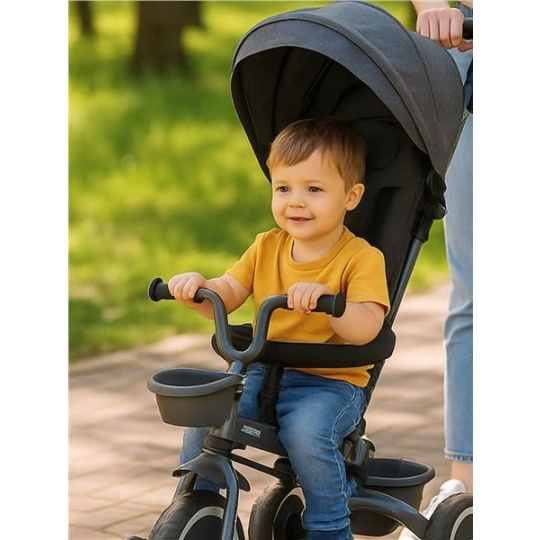 Dětská šlapací tříkolka Baby Mix 5v1 RELAX je multifunkční dopravní prostředek a je typickým příkladem produktů GROW UP - roste zároveň s dítětem. Tříkolku může ovládat jak dítě, tak i rodič pomocí nastavitelné vodící tyče. Po odebrání vodící tyče, sklápěcí stříšky, která chrání před sluncem nebo ostatních komponent bude sloužit jako tříkolka. Má moderní konstrukci, pohodlné a ergonomicky tvarované sedadlo, které je posuvné a otočné o 360 stupňů, což umožní dítěti cestovat ve směru nebo proti směru jízdy. Je vyrobena z kvalitních a odolných materiálů a skládací konstrukce umožňuje bezproblémovou přepravu tříkolky například v kufru auta. Její skládání je velmi jednoduché, intuitivní a nevyžaduje žádné nářadí. O pohodlí a bezpečí během jízdy se stará odnímatelná hrazda, pětibodové bezpečnostní pásy, pohodlné stupačky nebo kola vyrobena z tvrzené pěny EVA, která skvěle absorbují nerovnosti, poskytují perfektní přilnavost a nevyžadují huštění. Pro uložení hraček nebo potřeb pro dítě je zde praktický úložný košík.