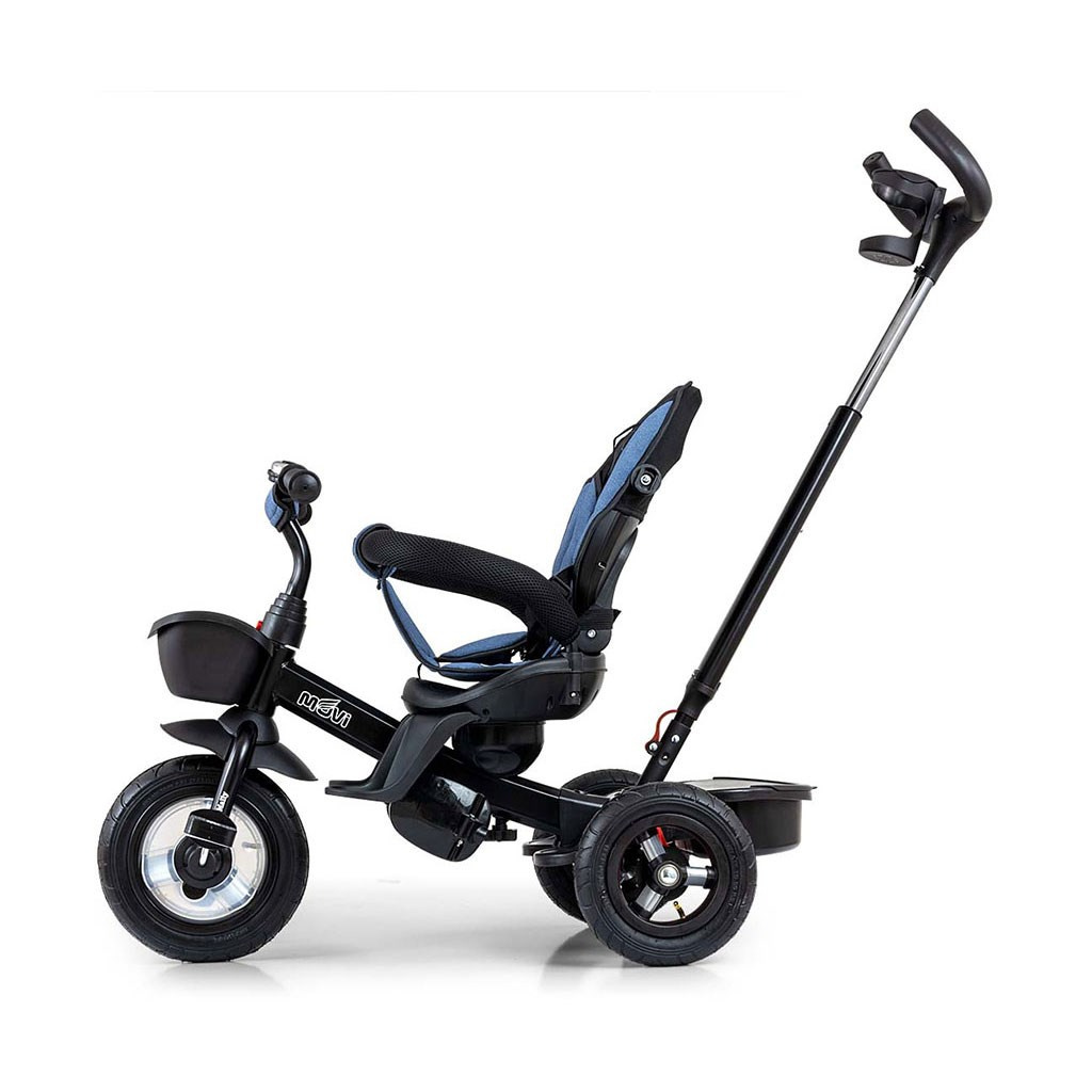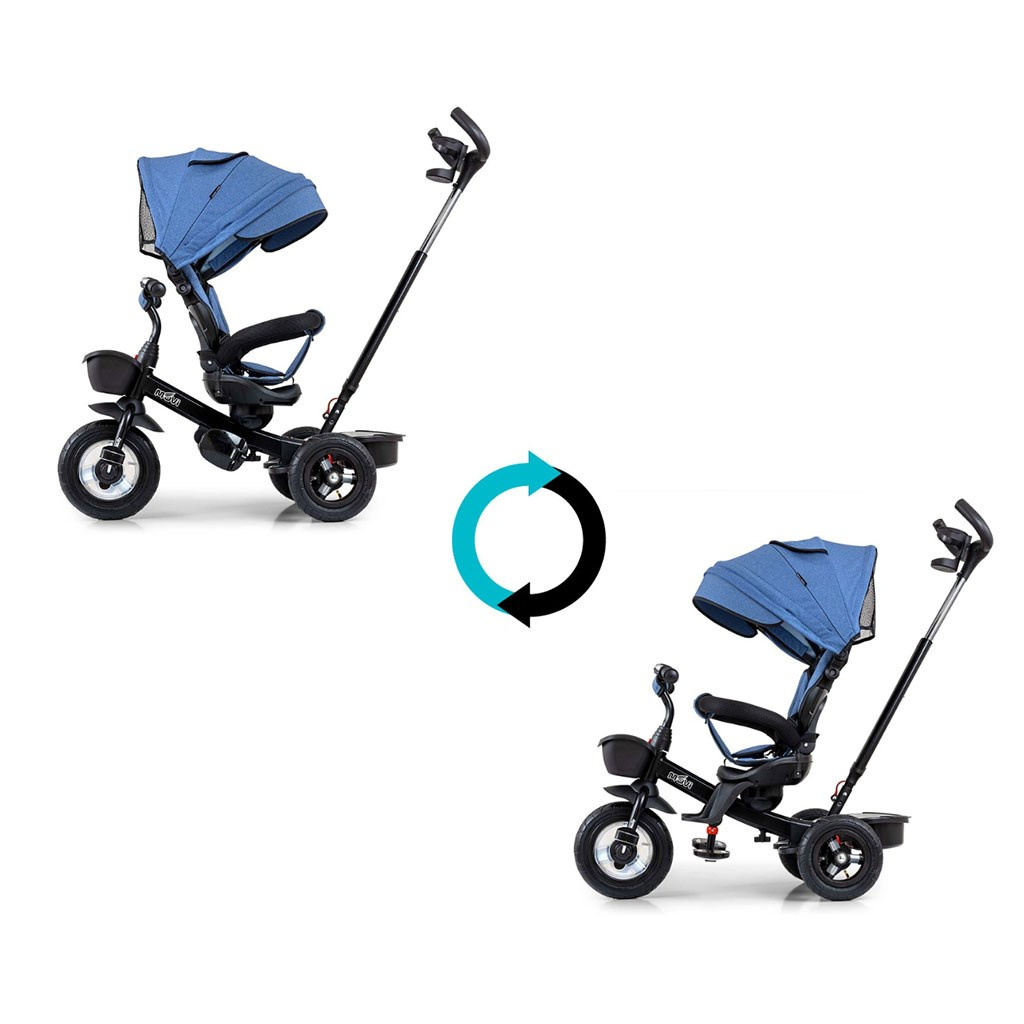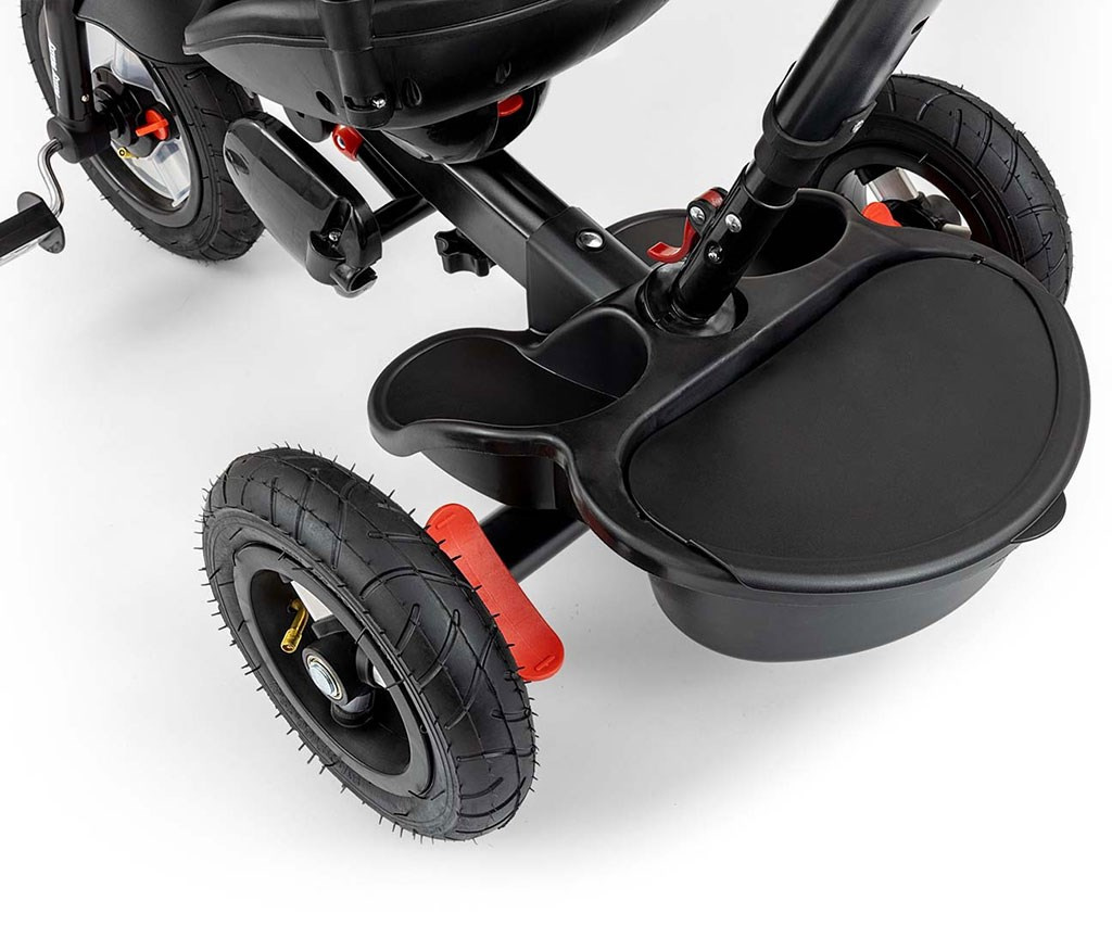 Je vyrobena z kvalitních a odolných materiálů. Má moderní konstrukci, pohodlné a ergonomicky tvarované sedadlo, které je otočné o 360 stupňů, což umožní dítěti cestovat ve směru nebo proti směru jízdy. O pohodlí a bezpečí během jízdy se stará bariérka, tříbodové bezpečnostní pásy, pohodlné stupačky nebo velká nafukovací kola, které skvěle absorbují rázy a poskytují dobrou přilnavost. Tříkolku může ovládat jak dítě, tak i rodič pomocí nastavitelné rukojeti pro tlačení. Po odebrání vodící tyče, sklápěcí stříšky, která chrání před sluncem nebo ostatních komponent bude sloužit jako tříkolka. Tříkolku lze používat rovněž jako alternativu golfového kočárku. Pro uložení hraček nebo potřeb pro dítě je zde praktický úložný košík.