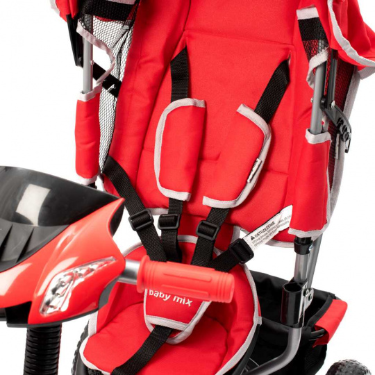 Představujeme Vám krásnou dětskou šlapací tříkolku se světly a klaksonem Baby Mix Lux Trike. Tříkolka je vyrobena z kvalitních a odolných materiálů. Její vyjímečnost ovšem spočívá v ovládacím panelu, umístěném na řídítkách. Přední část panelu obsahuje LED světla a směrovky. Na zadní straně panelu, směrem k dítěti, jsou pak umístěna tlačítka pro zapínámí světel, směrovek, včetně imitace zvuku směrovek, klakson a otočný ovladač po jehož otočení tříkolka vydává zvuk nastartování motoru a rozjezdu závodního auta. Pohodlí a bezpečí během letních procházek pak zajistí měkká opěrka, přední madlo či skládací stříška. Ochranné madlo je snadno odnímatelné. Pro uložení hraček nebo potřeb pro dítě, je zde úložný košík, praktická kapsička na zadní straně tříkolky. Tříkolka je určena pro děti od 18 do 36 měsíců, maximální zatížení je pak 25 kg. Napájení 3 x 1,5V typ baterie AA. Výrobek neobsahuje baterie.