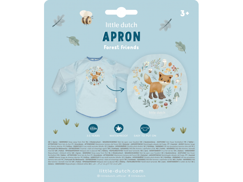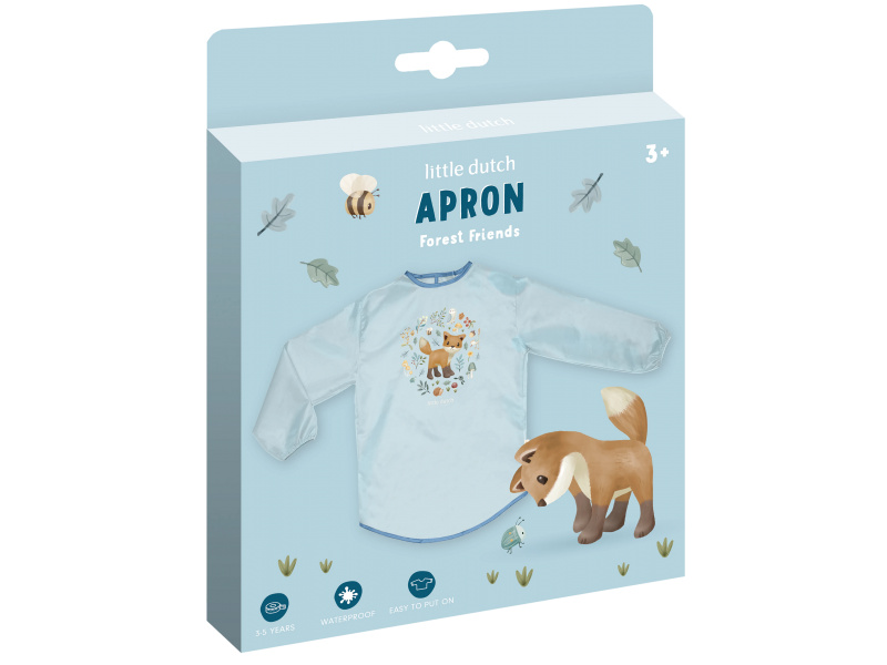 Když se vaše dítě pustí do malování, kreslení či jiného tvoření, barva může snadno skončit kdekoli na jeho oblečení. Tato lehká, voděodolná zástěra s dlouhými rukávy oblečení dítěte bezpečně ochrání. Díky zapínání na suchý zip vzadu a praktickým manžetám s gumičkou na rukávech se zástěra snadno obléká i svléká. Při znečištění stačí zástěru otřít vlhkým hadříkem. Zástěra s krásným potiskem je součástí designové kolekce hraček a doplňků Little Dutch Forest Friends, inspirované životem v lese. Materiál: polypropylen Vhodné pro děti cca od 3 do 5 let.