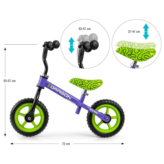 DRAGON poskytuje stabilitu, bezpečnost a pohodlí při jízdě doma i venku, například na zahradě. Lehká, ale odolná konstrukce zaručuje skvělou ovladatelnost za všech podmínek. Pěnová kola zajišťují plynulou jízdu a šetří nožičky malého cyklisty.