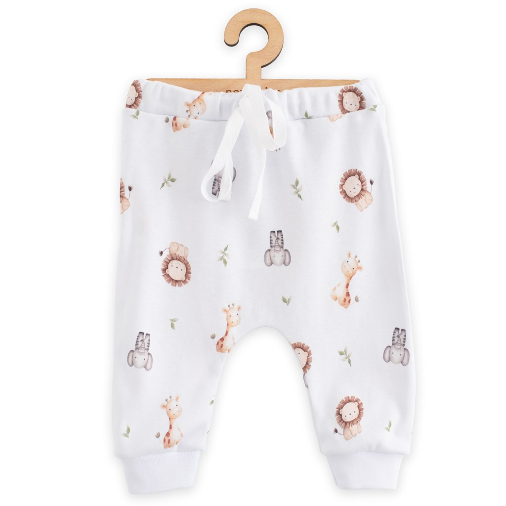 Kojenecké kalhoty jsou celopotištěné nápaditým dětským motivem. Pro snadné oblékání mají v pase gumičku, která netlačí a všitý ozdobný pásek na zavazování. Na hohavičkách jsou našité širší lemy.