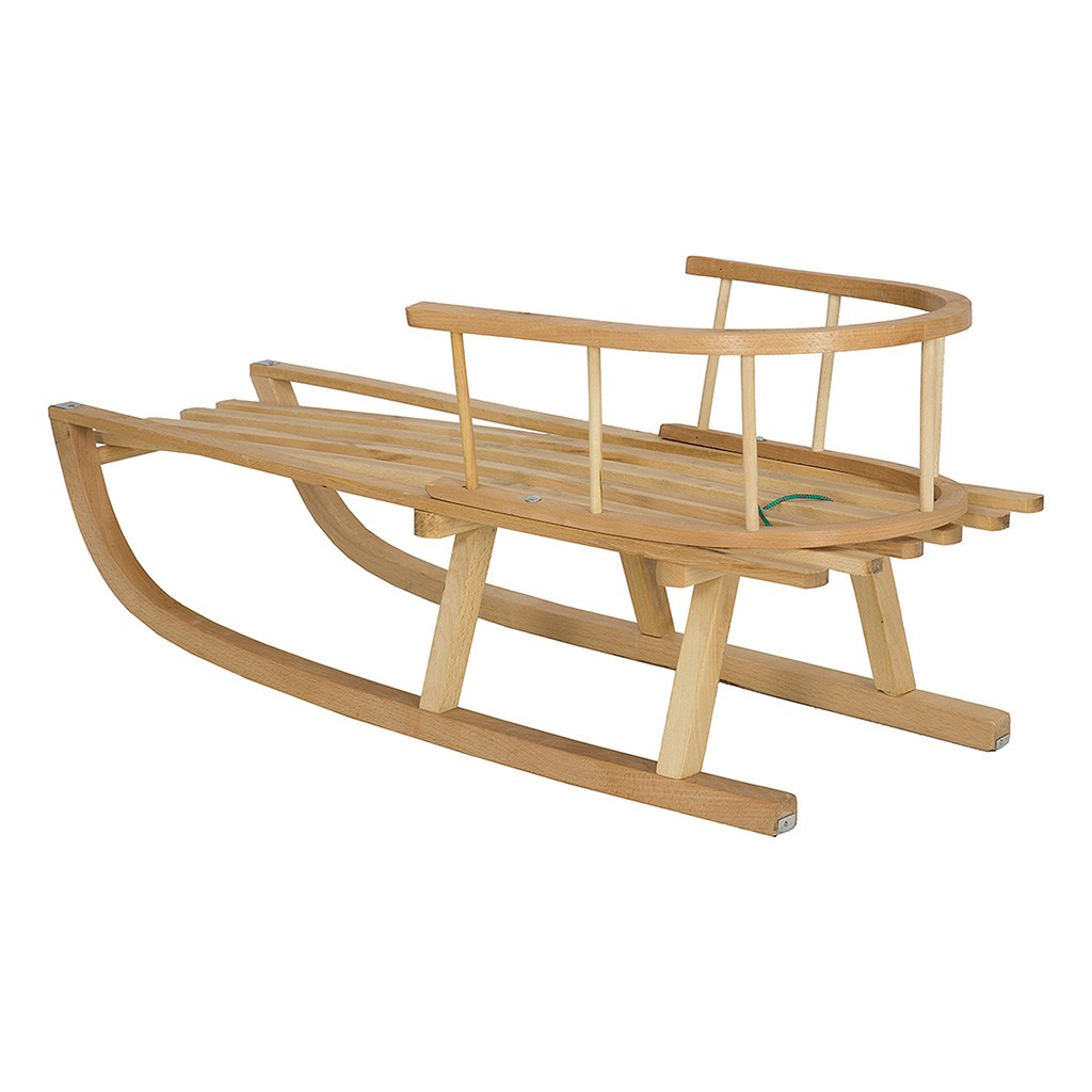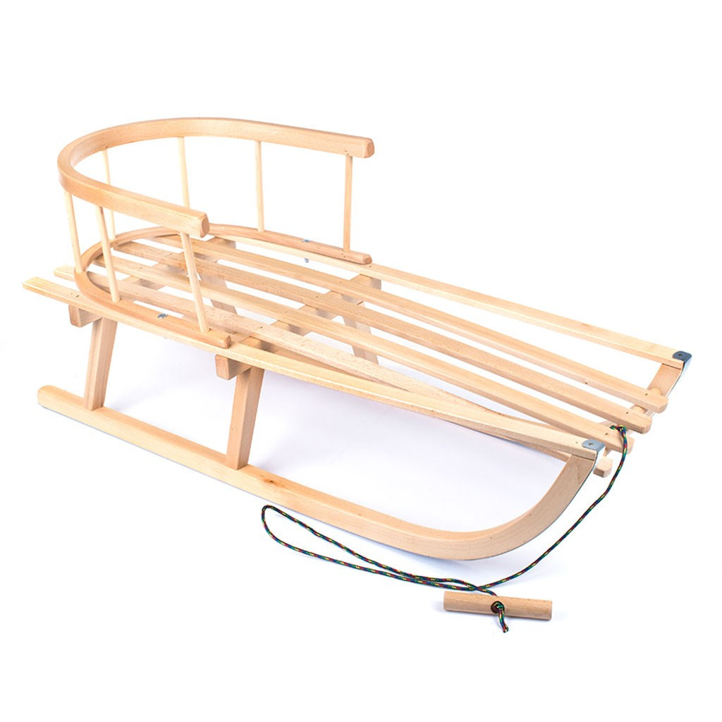 Dětské dřevěné sáňky s opěradlem a šňůrou z kvalitního bukového dřeva (tvrdé dřevo odolné proti poškození).