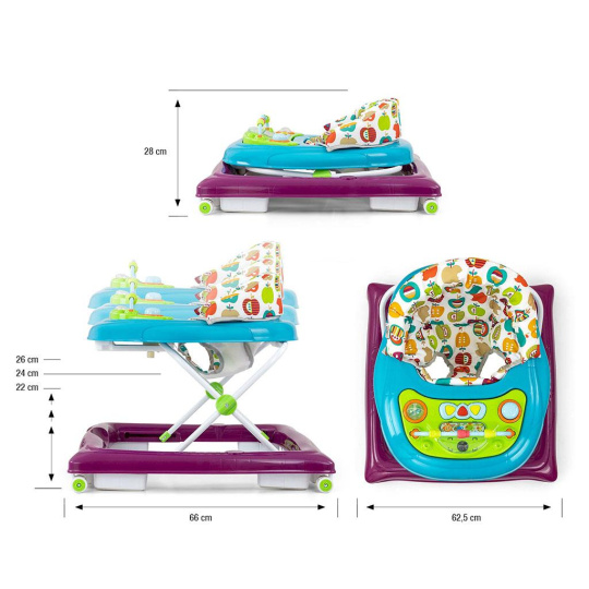 Výrobek má výukový panel, který obsahuje řadu překvapení čekajících na malé průzkumníky: světýlka, pískání, melodie, chrastítko, tlačítka a další pohyblivé prvky. Po sejmutí panelu z podnosu chodítka poslouží jako samostatná hračka, například jako společník na cesty, a deska poslouží jako hrací stolek.