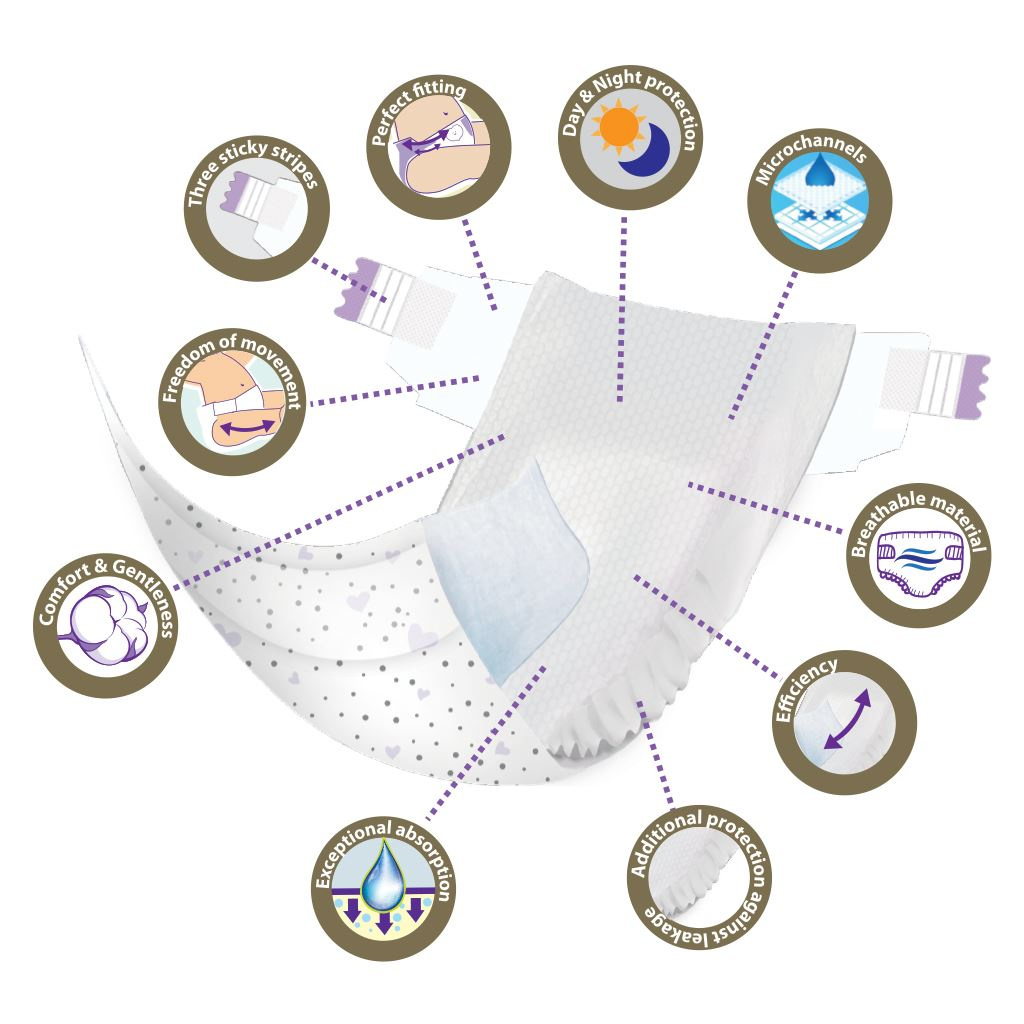 Hedvábně hebké dětské jednorázové pleny New Love Premium comfort byly speciálně navrženy proto, aby pokožka vašeho dítěte cítila lásku a péči již od prvního doteku. Speciálně navržený systém mikrokanálků zajistí rovnoměrné vsakování tekutiny, udržuje superabsorpční jádro na svém místě a zabraňuje hrudkování absorbéru. Inovativní jádro je tvořeno mikroperličkami, okamžitě odvádí vlhkost daleko od pokožky dítěte a pomáhá udržet zadeček dítěte stále v suchu až po dobu 12 hodin. Aby mohla pokožka volně dýchat, jsou plenky vyrobené z prodyšných materiálů zajišťujících cirkulaci vzduchu.