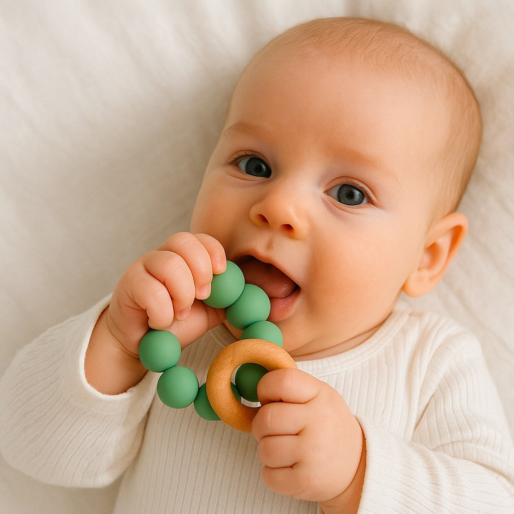 Přírodní materiály: Vyrobeno z kombinace dřeva a měkkého, bezpečného silikonu (bez BPA), který je šetrný k dětským dásním.