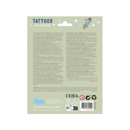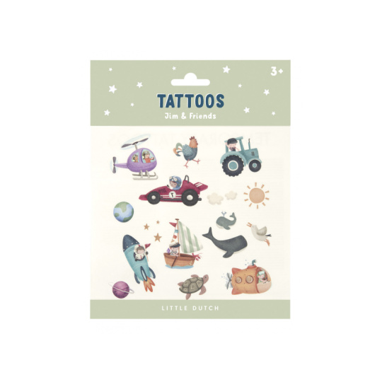 Dočasné dětské tetování s krásnými motivy Jima a různých dopravních prostředků a zvířat. Samolepicí tetování se snadno aplikuje s pomocí vlhké houbičky. Arch obsahuje 12 ks tetovaček. Vhodné pro děti od 3 let.