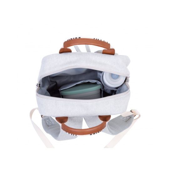 Stylový baťůžek pro vaše dítě Childhome Mini Club je svojí velikostí je ideální pro děti od 3 do 5 let. Hlavní prostor baťůžku je vybaven termoizolační kapsou na nápoj a kapsou na svačinový box, přední kapsa na zip umožňuje bezpečné uložení drobností. Měkce polstrované ramenní popruhy s nastavitelnou délkou zaručují příjemné nošení na zádech, držadla usnadňují přenášení v ruce. Baťůžek je vyroben ze silného plátna s podšívkou. Díky kvalitnímu voděodolnému materiálu jej stačí při znečištění otřít vlhkým hadříkem. Složení: 65% bavlna, 35% polyester, podšívka 100% nylon. Rozměry: 32 x 23 x 10 cm Objem: 7 l