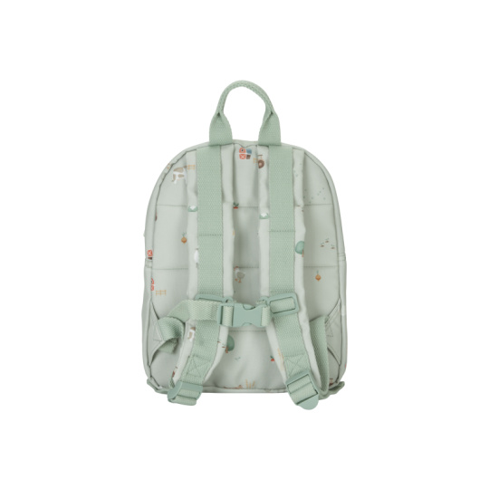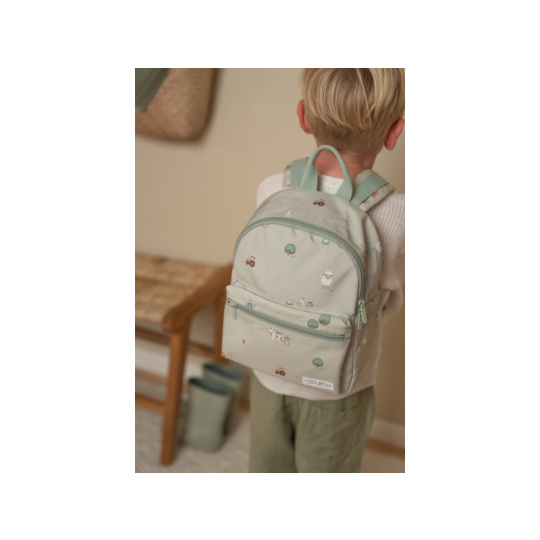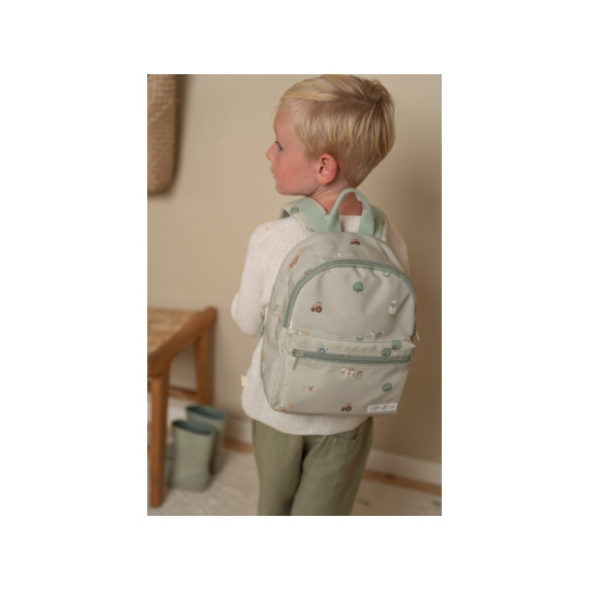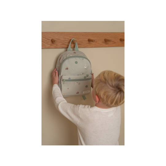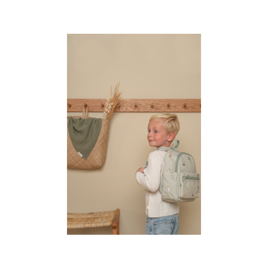 Roztomilý dětský batůžek potištěný obrázky zvířátek z farmy je ideálním doplňkem na výlety do přírody i procházky městem. Batůžek má nastavitelné ramenní popruhy a hrudní pás pro příjemné nošení. Držadlo umožňuje přenášení v ruce. Batůžek je vybaven vnější kapsou na zip pro uložení drobností a vnitřní prostor s kapsou, elastickým držákem na pití a jmenovkou. Batůžek je součástí designové kolekce hraček a doplňků pro děti Little Dutch Farma. Je výjimečný i tím, že jeho výroba je šetrná k naší planetě díky použití až 10 recyklovaných plastových lahví. Rozměry: 12 x 22,5 x 29 cm