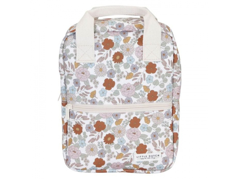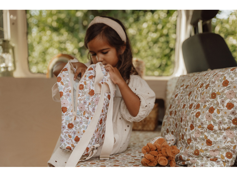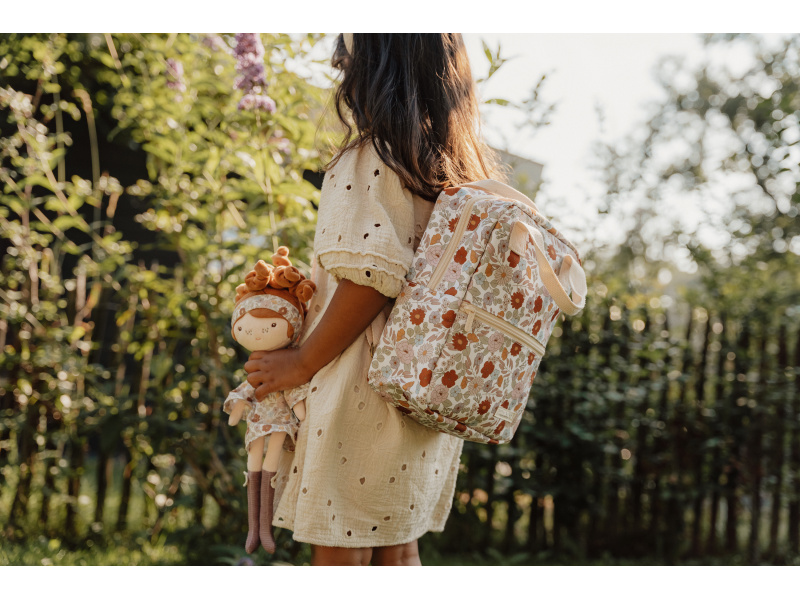 Krásný dětský batůžek potištěný květinovými motivy je ideálním doplňkem na výlety do přírody i procházky městem. Batůžek má nastavitelné ramenní popruhy. Držadla umožňují přenášení v ruce. Batůžek je vybaven vnější kapsou na zip pro uložení drobností, ve vnitřním prostoru najdete elastický držák na pití a jmenovku. Batůžek je součástí designové kolekce Little Dutch Vintage Kytičky. Batůžek je výjimečný i tím, že jeho výroba je šetrná k naší planetě díky použití až 10 recyklovaných plastových lahví. Rozměry: 26 x 20 x 10 cm