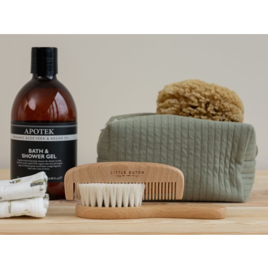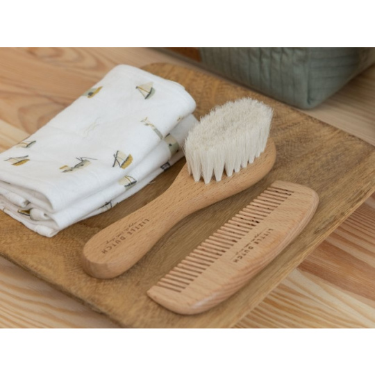 Sada pro každodenní péči o dětské vlásky obsahuje dřevěný kartáč s měkkými štětinami a hřeben se širokými zuby, které jsou šetrné k citlivé pokožce hlavy miminka. Měkké štětiny kartáče jemně masírují pokožku hlavy a podporují prokrvení Hřeben se širokými zuby pomáhá vlasy snadno rozčesat a upravit Ideální pro každodenní rituál po koupeli nebo před spaním Stylový a praktický doplněk pro každou dětskou výbavičku Vhodné pro děti od narození.