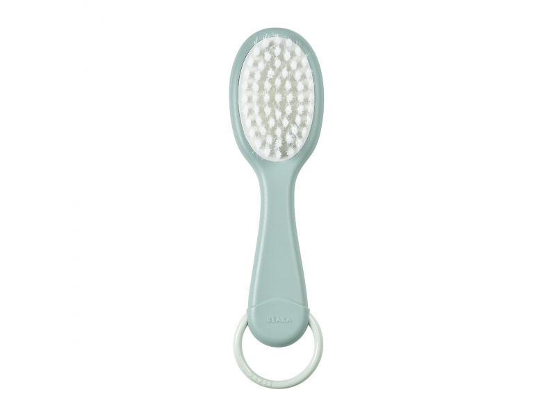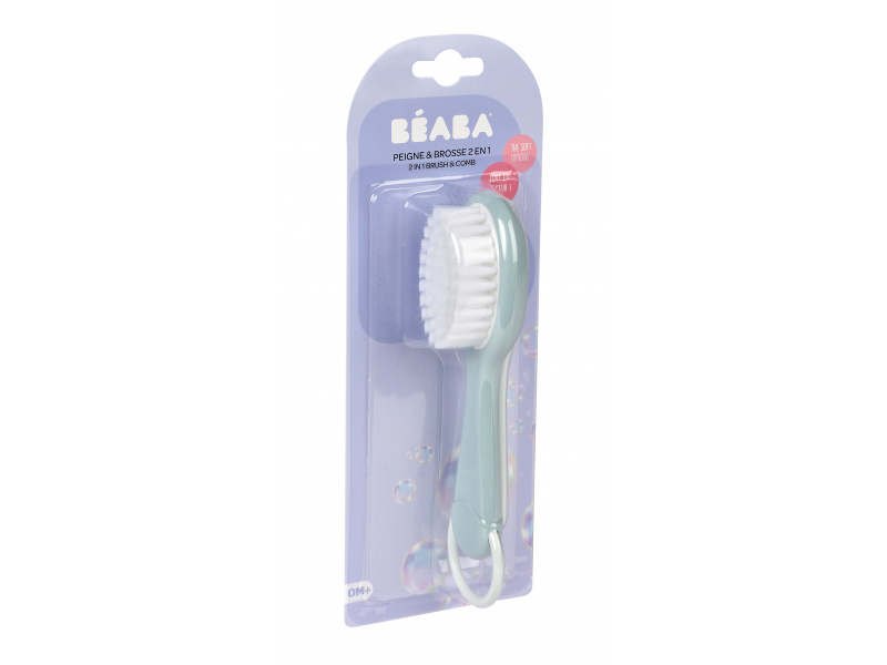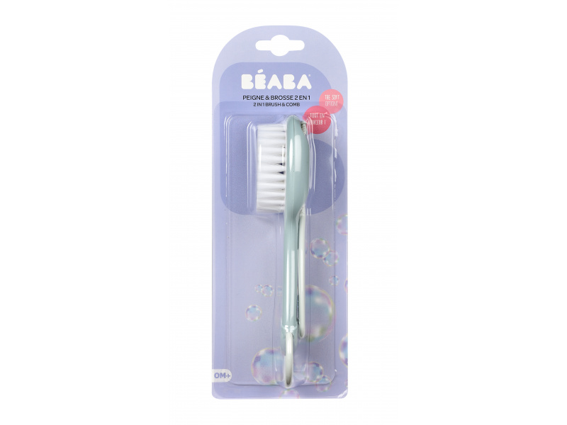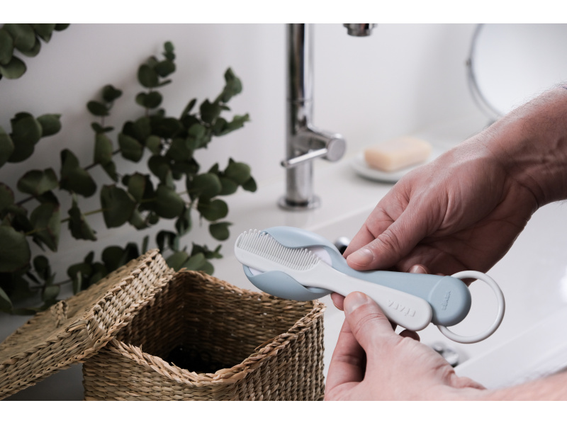Sada pro péči o vlásky vašeho dítěte od narození obsahuje kartáč s měkkými štětinami a hřebínek se zaoblenými zuby. Ergonomický tvar kartáče i hřebene usnadňuje rodiči uchopení. Hřebínek je uložený v zadní části kartáče, celou sadu můžete díky kroužku snadno zavěsit na háček. Vhodné pro děti od narození.