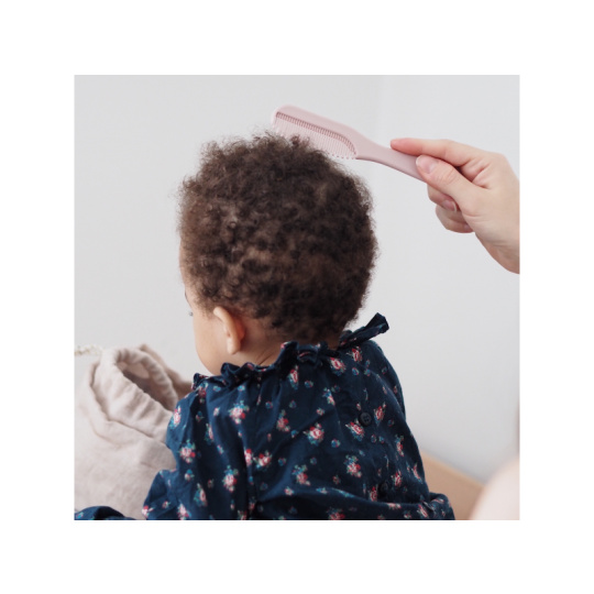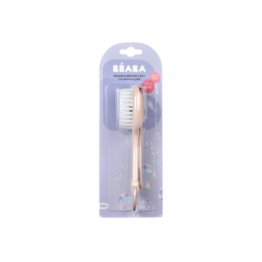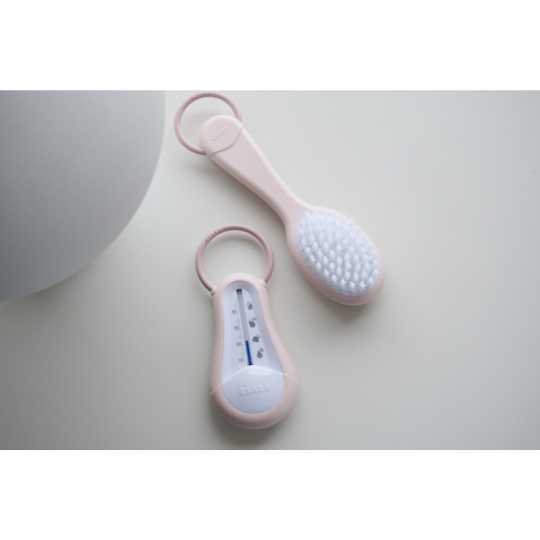 Sada pro péči o vlásky vašeho dítěte od narození obsahuje kartáč s měkkými štětinami a hřebínek se zaoblenými zuby. Ergonomický tvar kartáče i hřebene usnadňuje rodiči uchopení. Hřebínek je uložený v zadní části kartáče, celou sadu můžete díky kroužku snadno zavěsit na háček. Vhodné pro děti od narození