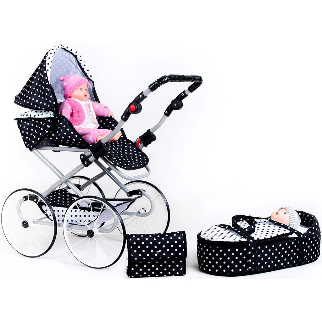 Krásný a jedinečný dětský Retro kočárek 2v1 New Baby Natálka pro malé slečny. Kočárek je velmi kvalitní s kovovou konstrukcí. Hluboký kočárek lze upravit i na sportovní. Korbička je upevněná ve směru jízdy a lze jí použít na přenášení panenky. Korbička má zapínání na zip. Kočárek má nastavitelnou rukojeť. Součástí je i taška na drobnosti v barvě kočárku a velký nákupní košík. Moderní a lehký kočárek pro panenky s klasickou odpruženou konstrukcí v pestrých barvách. Kočárek má pojistku proti samovolnému složení. Vyrobeno v EU.