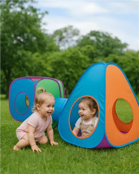 Krásný dětský stan Baby Mix 3v1 je trojdílnou sadou, skládájící se ze dvou samostatných stanů propojených plazícím tunelem. Tunel se do stanů jen zasune, není na pevno připevněn, lze s ním libovolně manipulovat. Otvory zajišťují dobrou cirkulaci vzduchu. Je vyrobený z kvalitní a pevné látky. Určeno pro děti od 3let.