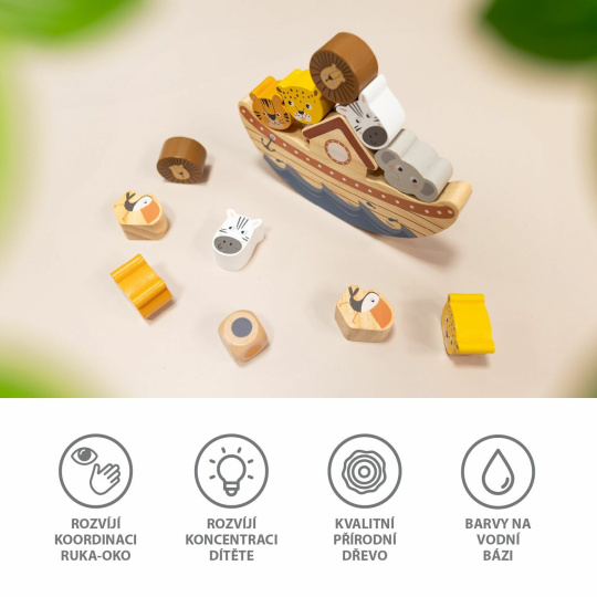 Nechte děti, aby poznaly, jak funguje gravitace a naučily se prostorového vnímání. Zábavnou formou se budou učit o tom, jak skládat předměty, tak aby držely balanc. Hra je vhodná i pro jednoho hráče. V případě, že jí hraje více hráčů prohrává ten, komu zvířátka z archy vypadnou jako prvnímu.