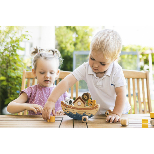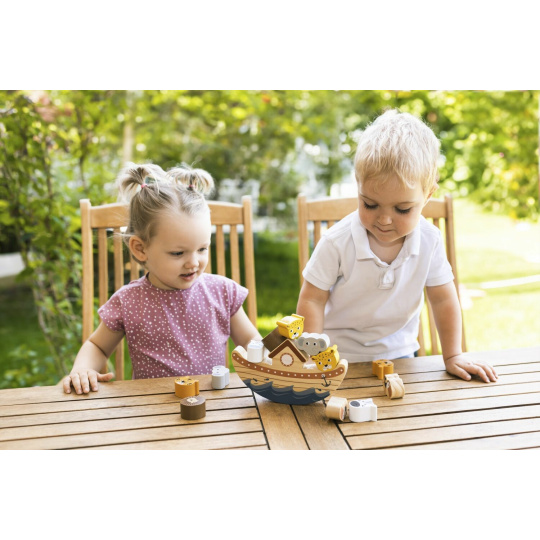 Hrajte sami nebo ve více lidech, děti, dospěli, babičky, dědečkové – tahle zábavná hra bude bavit všechny! Postupně naloďte všechna dřevěná zvířátka na palubu, ale pozor! Čím více zvířátek na palubě je, tím více hrozí, že se archa převrhne, nebo zvířátka z lodi vypadnou!