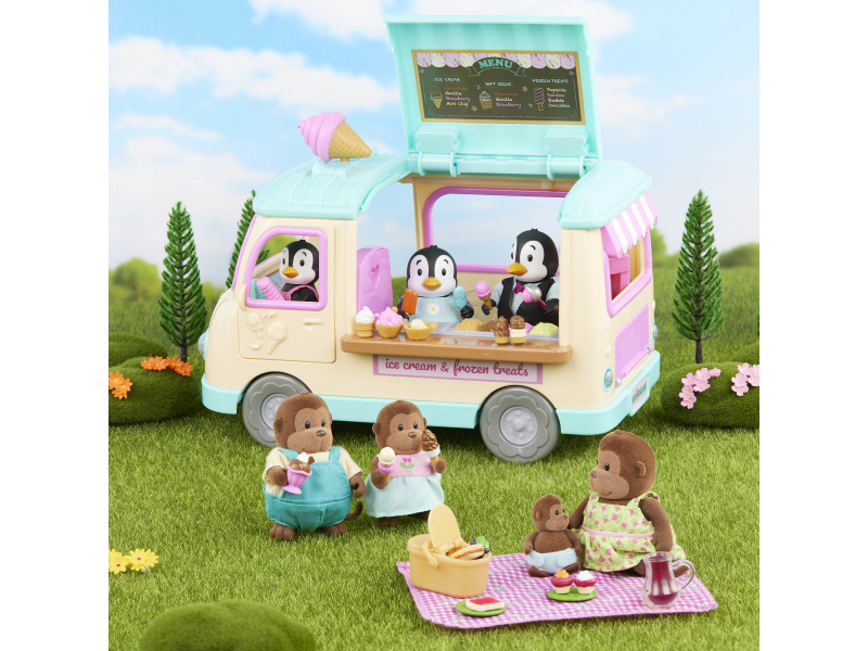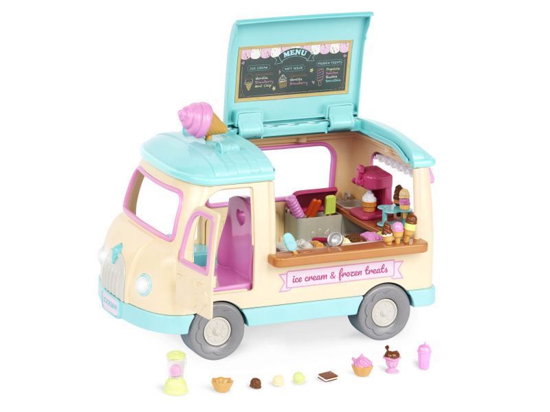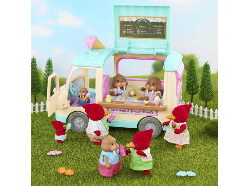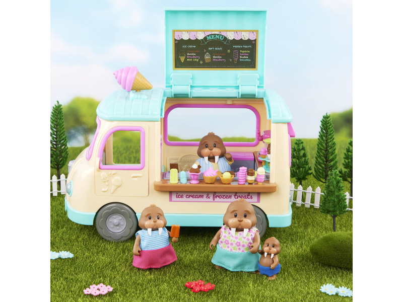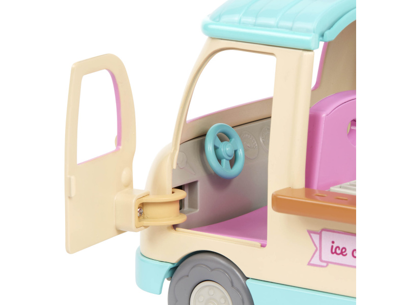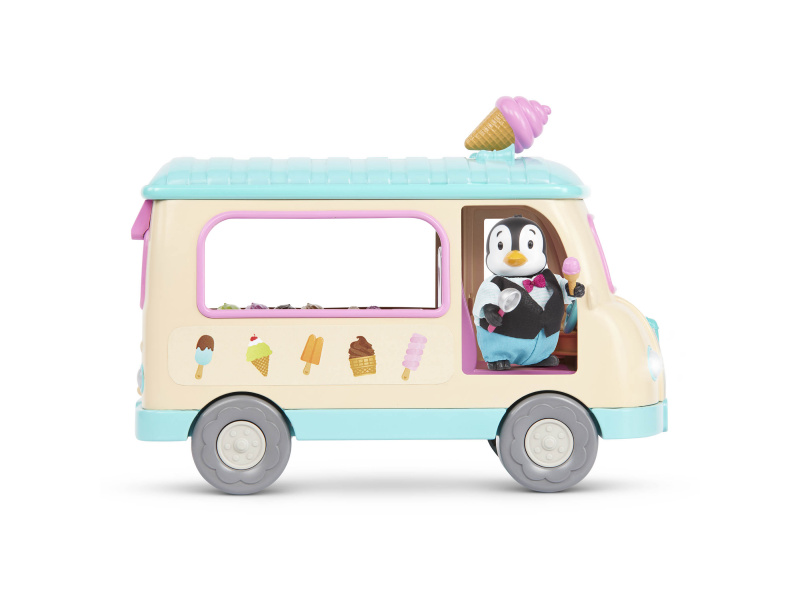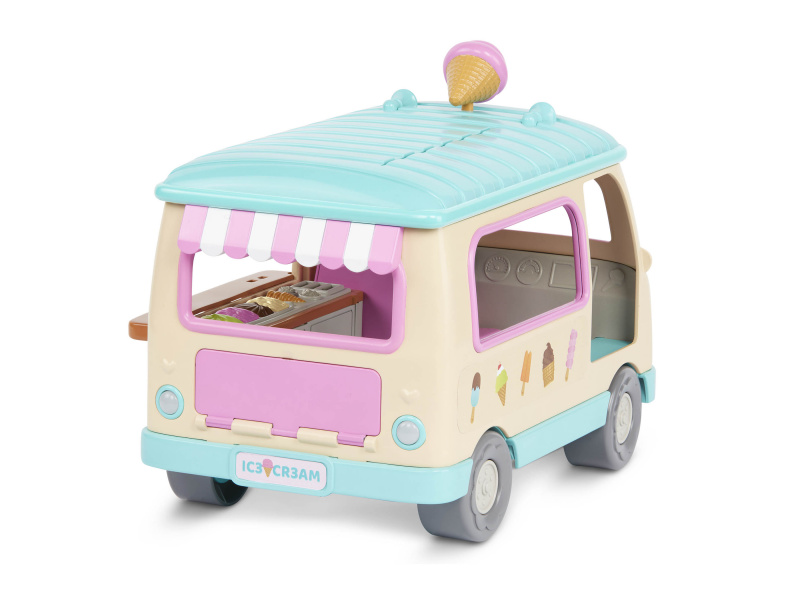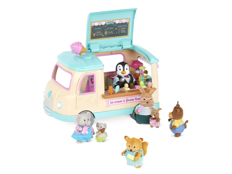 Dodávka se zmrzlinou přiváží obyvatelům městečka Honeysuckle Hollow každý letní den zmrzlinu, nanuky i mléčné koktejly vlastní výroby. Až budete vjíždět do městečka, nezapomeňte zmáčknout volant, kterým se rozsvítí světla a ozve se zvuk, aby všichni vědělí, že jedete! Postavičky zvířátek nejsou součástí balení, prodávají se samostatně. 27-dílná sada obsahuje dodávku a zmrzliny, nanuky a vše potřebné pro prodej chladivého občerstvení. Samostatně prodávané postavičky zvířátek Li'l Woodzeez jsou vyrobené z měkkého příjemného materiálu a mají pohyblivé ruce, nohy i hlavy pro zábavnou předstíranou hru. Součástí samostatně prodávané nabídky doplňků Li'l Woodzeez jsou domečky, obchody i dopravní prostředky. Všechny postavičky a doplňky Li'l Woodzeez jsou navzájem kompatabilní a umožní vám vytvořit originální městečko pro nekonečnou hru rozvíjející fantazii a kreativitu vašeho dítěte. Rozměry: 27,5 x 17 x 16,7 cm Baterie 3xAAA 1,5V nejsou součástí balení. Vhodné pro děti od 3 let.