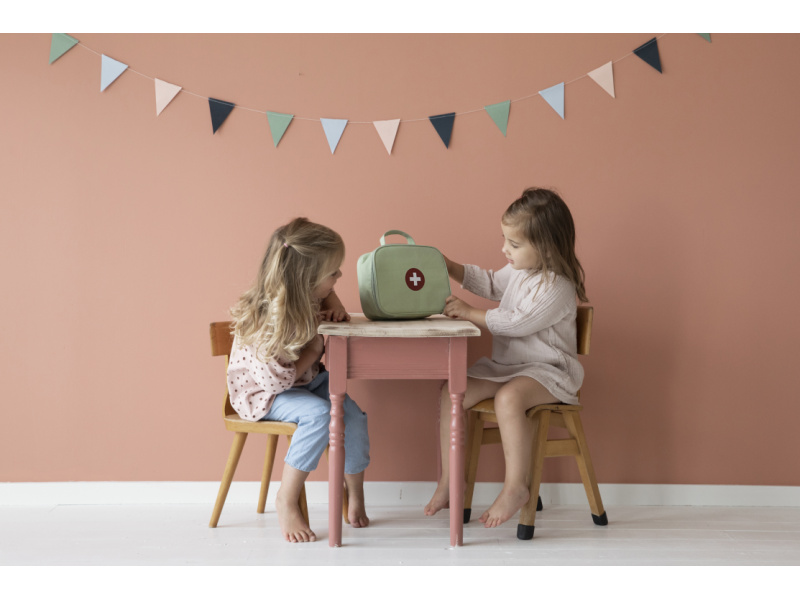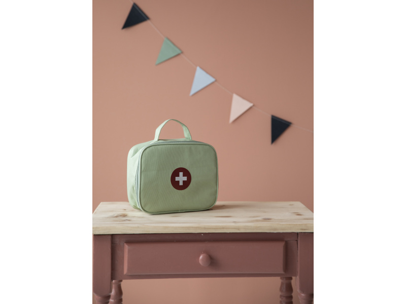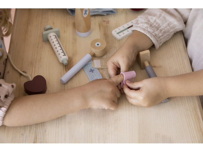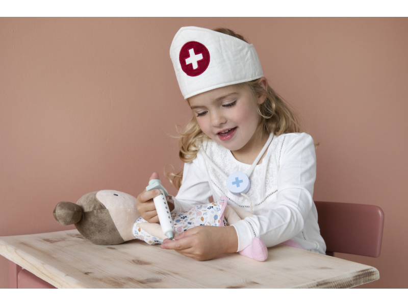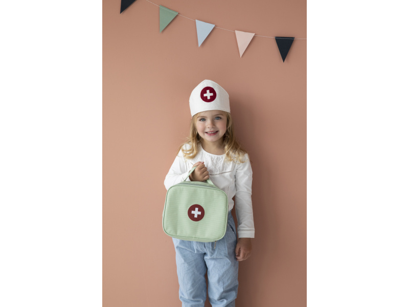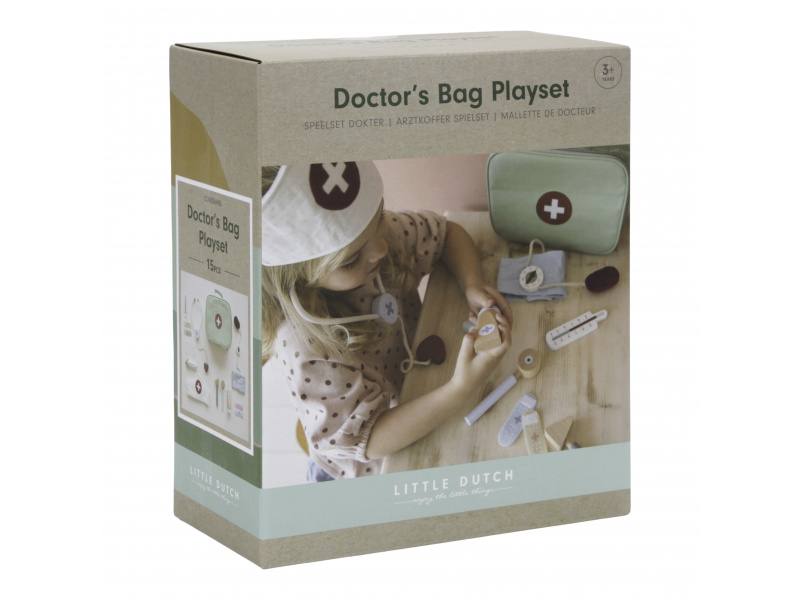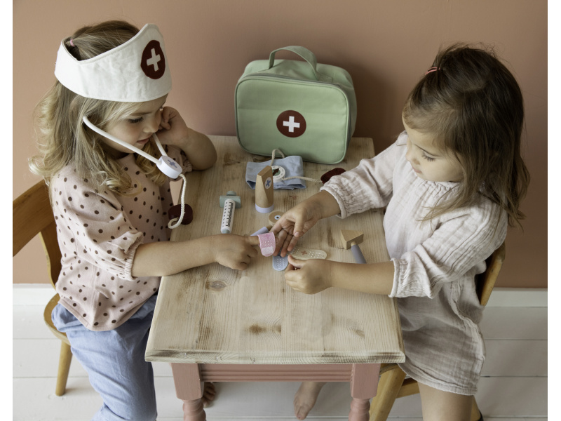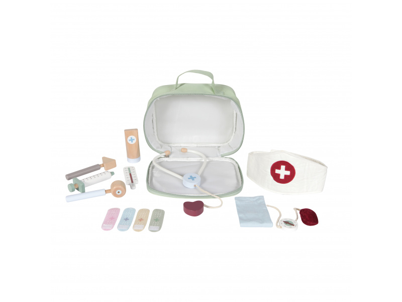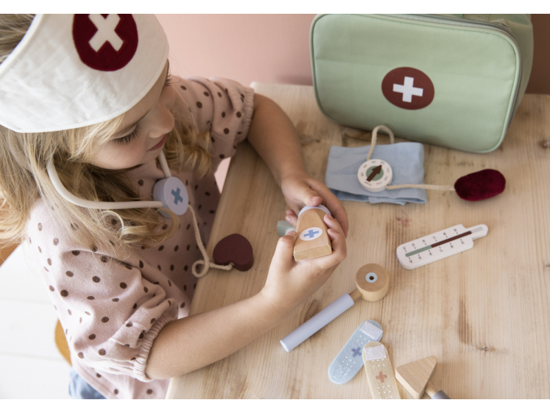 Pacienti vašeho malého lékaře či lékařky se budou cítit mnohem lépe, když bude mít po ruce tuto lékařskou brašnu. Obsah brašny umožňuje změřit teplotu, zkontrolovat tep a krevní tlak a poslechnout si pacienta s pomocí stetoskopu. Sada obsahuje plátěnou lékařskou brašnu, náplast (4 různé barvy), dřevěný teploměr, stříkačku, tubu s mastí, stetoskop, reflexní kladivo, měřič krevního tlaku, otoskop, čepičku. Balení: 9,4 x 23 x 19 cm Vhodné pro děti od 3 let.