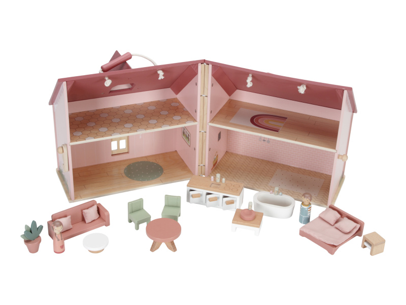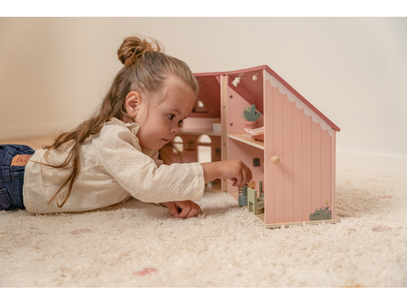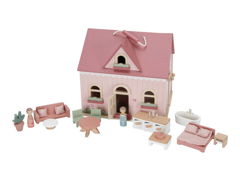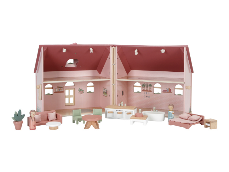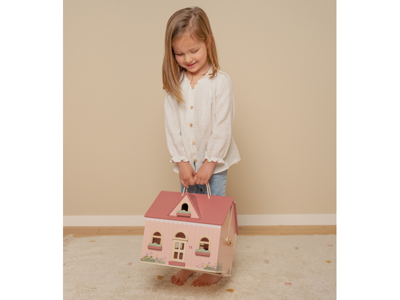 Roztomilý dřevěný domeček pro panenky Little Dutch má v přízemí obývací pokoj s kuchyní a v patře ložnici s koupelnou. Každý pokoj je zařízen odpovídajícím nábytkem a doplňky, součástí jsou i dvě dřevěné panenky Jim a Rosa. K domečku je možné dokoupit další sady nábytku, domází mazlíčky apod. Pro pohodlné hraní se domeček snadno otevírá i zavírá. Díky rukojeti se snadno přenáší. Rozměry: 30 x 28 x 27,5 cm Vhodné pro děti od 3 let.