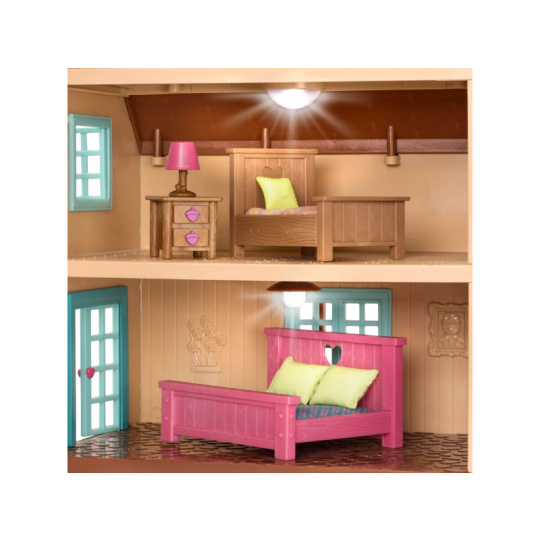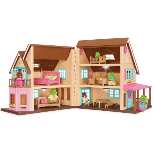 Otevírací 3-patrový domeček Hillside Cottage poskytuje nádherné bydlení postavičkám zvířátek Li'l Woodzeez. Uvnitř najdete nábytek včetně postelí pro celou rodinu, stolu se židlemi, pohovky atd. Ložnice v horním patře má vstup balkon, v přízemí je krásná veranda pro relaxaci venku a houpačka pro zábavu dětí. A když se večer setmí, můžete zapnout vnitřní i venkovní osvětlení! 20-dílná sada obsahuje domeček s funkčními světly, pohovku, 2 polštáře, stůl a 2 lavice, postel s matrací a 2 polštáři, dětskou postýlku s matrací a polštářem, postýlku s matrací a polštářem, noční stolek, lampu a houpačku. Samostatně prodávané postavičky zvířátek Li'l Woodzeez jsou vyrobené z měkkého příjemného materiálu a mají pohyblivé ruce, nohy i hlavy pro zábavnou předstíranou hru. Součástí samostatně prodávané nabídky doplňků Li'l Woodzeez jsou domečky, obchody i dopravní prostředky. Všechny postavičky a doplňky Li'l Woodzeez jsou navzájem kompatabilní a umožní vám vytvořit originální městečko pro nekonečnou hru rozvíjející fantazii a kreativitu vašeho dítěte. Postavičky zvířátek Li'l Woodzeez nejsou součástí balení. Rozměry: 46 x 38 x 40 cm Vhodné pro děti od 3 let.